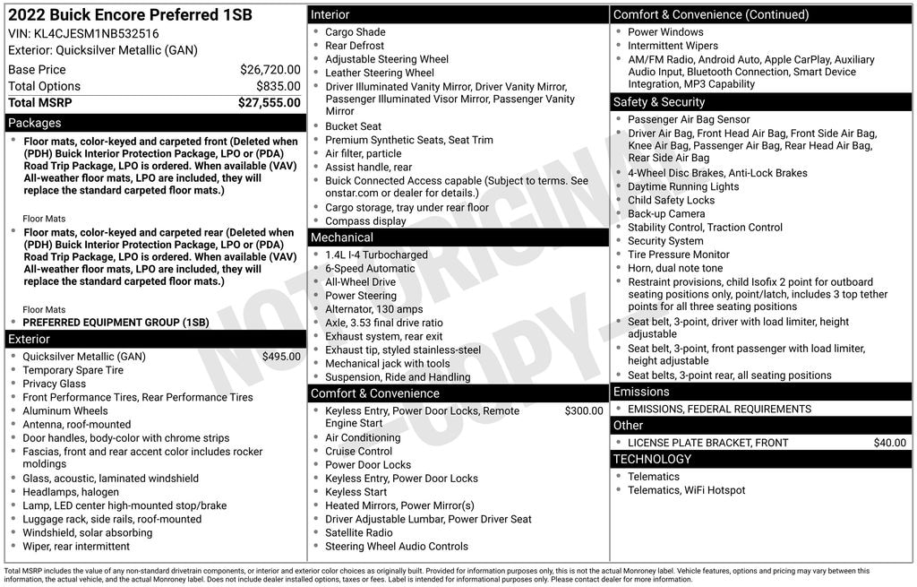 125 point inspection, 110 point inspection certified, 172 point inspection certified, 1st oil change free with purchase, 2 Key Fobs, service report available, Encore Preferred, 4D Sport Utility, 1.4L ECOTEC Turbo VVT DOHC 4-Cyl SIDI, 6-Speed Automatic Electronic with Overdrive, AWD, Quicksilver Metallic, Ebony Cloth, 18" Aluminum Wheels, 2-Way Manual Front Passenger Seat Adjuster, 3.53 Final Drive Axle Ratio, 4-Wheel Disc Brakes, 6 Speakers, 6-Speaker Audio System, 6-Way Power Driver Seat Adjuster, ABS brakes, Air Conditioning, Alloy wheels, AM/FM radio: SiriusXM, Apple CarPlay/Android Auto, Brake assist, Bumpers: body-color, Cloth w/Leatherette Seat Trim, Compass, Delay-off headlights, Driver door bin, Driver vanity mirror, Driver's Seat Mounted Armrest, Dual front impact airbags, Dual front side impact airbags, Electronic Stability Control, Emergency communication system: OnStar and Buick connected services capable, Exterior Parking Camera Rear, Front anti-roll bar, Front Bucket Seats, Front License Plate Bracket, Front reading lights, Front wheel independent suspension, Fully automatic headlights, Heated door mirrors, Illuminated entry, Knee airbag, Leather steering wheel, Low tire pressure warning, Occupant sensing airbag, Outside temperature display, Overhead airbag, Panic alarm, Passenger door bin, Passenger vanity mirror, Power door mirrors, Power driver seat, Power steering, Power windows, Radio data system, Radio: 7" Diagonal Buick Infotainment System, Rear seat center armrest, Rear side impact airbag, Rear window defroster, Rear window wiper, Remote keyless entry, Remote Vehicle Starter System, Ride & Handling Suspension, Roof rack: rails only, Security system, SiriusXM Radio, Speed control, Speed-sensing steering, Split folding rear seat, Spoiler, Tachometer, Telescoping steering wheel, Tilt steering wheel, Traction control, Trip computer, Variably intermittent wipers.