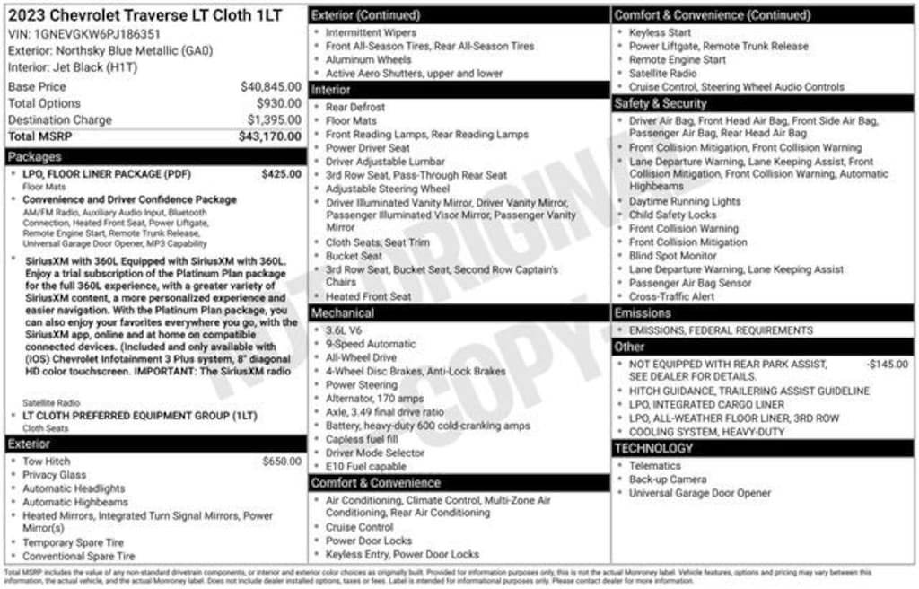 Northsky Blue Metallic 2023 Chevrolet Traverse LT 1LT 3.6L V6 SIDI VVT 9-Speed Automatic AWD 4D Sport Utility