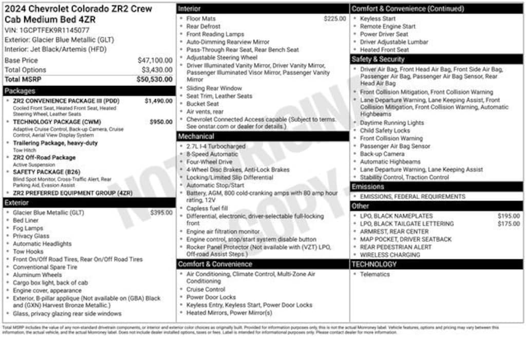 Recent Arrival! CARFAX One-Owner. Clean CARFAX. Odometer is 2768 miles below market average!*** WE DELIVER ***Glacier Blue Metallic 2024 Chevrolet Colorado ZR2 4D Crew Cab 2.7L I4 Turbocharged DOHC 16V LEV3-ULEV50 310hp 8-Speed Automatic 4WDCertified. Chevrolet Certified Pre-Owned Details:* Transferable Warranty* Warranty Deductible: $0* Vehicle History* 172 Point Inspection* 24 months/24,000 miles (whichever comes first) Certified Pre-Owned Scheduled Maintenance Plan and 3 days/150 miles (whichever comes first) Vehicle Exchange Program. SiriusXM 3-month trial subscription.* Roadside Assistance* Powertrain Limited Warranty: 72 Month/100,000 Mile (whichever comes first) from original in-service date* Limited Warranty: 12 Month/12,000 Mile (whichever comes first) from certified purchase date1st & 2nd Row All-Weather Floor Liner (LPO), 3.42 Rear Axle Ratio, 4-Way Manual Passenger Seat Adjuster, 4-Wheel Disc Brakes, 6 Speakers, 6-Speaker Audio System Feature, 8-Way Power Driver Seat Adjuster, ABS brakes, Adaptive Cruise Control, Air Conditioning, Alloy wheels, AM/FM radio: SiriusXM, Apple CarPlay/Android Auto, Auto High-beam Headlights, Auto-dimming Rear-View mirror, Automatic Emergency Braking, Automatic temperature control, Black Nameplates (LPO), Black Tailgate Lettering (LPO), Blind Zone Steering Assist w/Trailering, Brake assist, Chevy Safety Assist, Cloth/Evotex Seat Trim, Compass, Delay-off headlights, Driver & Front Passenger Ventilated Seats, Driver door bin, Driver Memory Settings, Driver Seatback Map Pocket, Driver vanity mirror, Dual front impact airbags, Dual front side impact airbags, Electronic Automatic Cruise Control, Electronic Stability Control, Following Distance Indicator, Forward Collision Alert, Front anti-roll bar, Front Bucket Seats, Front Center Armrest, Front dual zone A/C, Front fog lights, Front Passenger Seatback Map Pocket, Front Pedestrian & Bicyclist Braking, Front reading lights, Front wheel independent suspension, HD Surround Vision, Heated door mirrors, Heated Driver & Front Passenger Seats, Heated front seats, Heated Steering Wheel, Illuminated entry, IntelliBeam Automatic High Beam On/Off, Lane Keep Assist w/Lane Departure Warning, Low tire pressure warning, Navigation System, Occupant sensing airbag, Outside temperature display, Overhead airbag, Overhead console, Panic alarm, Passenger door bin, Passenger vanity mirror, Perforated Leather-Appointed Seat Trim, Power door mirrors, Power Driver Lumbar Control Seat Adjuster, Power driver seat, Power steering, Power windows, Preferred Equipment Group 4ZR, Radio data system, Radio: 11.3 Diagonal Advanced Color LCD Display, Rear Center Armrest, Rear Cross Traffic Braking, Rear Park Assist, Rear Pedestrian Alert, Rear reading lights, Rear step bumper, Rear window defroster, Rear-Window Electric Defogger, Remote keyless entry, Safety Package, Security system, SiriusXM Radio, Speed control, Speed-sensing steering, Split folding rear seat, Steering Wheel Mounted Audio Controls, Steering wheel mounted audio controls, Tachometer, Technology Package, Telescoping steering wheel, Tilt steering wheel, Traction control, Trip computer, Variably intermittent wipers, Wheels: 17 x 8 Graphite & Oxide Gold Aluminum, Wireless Charging, Wireless Phone Projection, ZR2 Convenience Package III, ZR2 Off-Road Package.