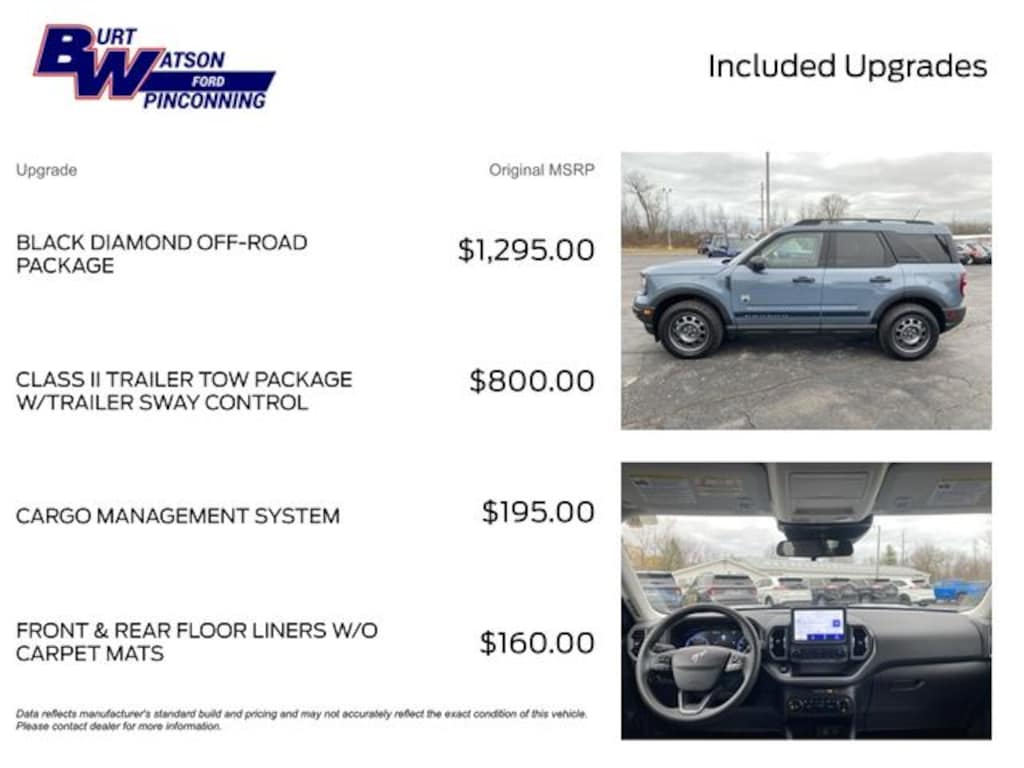 I got a 2025 Big Bend with the black diamond off road package. The steel modular front and rear in combination with bush guard gives this year model. A very aggressive off road look. With the ability to easily mount accessories and power them with the factory installed auxiliary switches. Hitch receiver seamlessly mounted into the rear steel bumper flanked by some very chunky recovery points. The upgraded aluminum rims wrapped with Continental all-terrains. It make this the most capable bronco sport yet. The interior of the 2025 has been updated with a new 13 inch touchscreen with Android Auto and apple car play. The lines of the dash flow elegantly from the new infotainment screen to the new all digital 12 inch gauge chaster. Toggling through the different modes on the gauge chaster is very intuitive, and all the displays are laid out very cleanly. Moving from gauge chaster the center storage cubby just below the infotainment screen there is a wireless charger and USB/ USB-c ports. The passenger side of that same cubby gets a handle and a matching one on the roof just in case the driver bucks a little too much. The passenger also gets a mesh storage area. That leads us to the fact this vehicle has tons of storage options all throughout. You have pockets on the sides of the front two seat big enough for the latest new phones. Very generous door storage on all four doors plus huge glove box and center console with 12 volt outlet. The back side of the center console has air vents and another 12 volt outlet plus a 110 outlet. Now getting to the cargo area it is massive for a crossover SUV. With off road package you get a cargo management system and a very nice rubber mat. Under that there is a full size tire plus scissor jack and funnel to use with the capless filler system. On the liftgate there isa pair of very bright led lights turned on with a switch in the cargo area. This feature packed vehicle has tons awesome gadgets and hidden a little homages I spend all day just talk that. At the end of the day it is car. So how does it drive. It is wonderful, the steering and pedal response is beautiful. Rides very smooth and little to no road noise going down the highway. The active cruise control and co-pilot 360 have been very handy. The car literally drives itself most of the time. There is not enough good things I could same about this car. I love it and you pick one too. You will see what I mean.… - 5.0