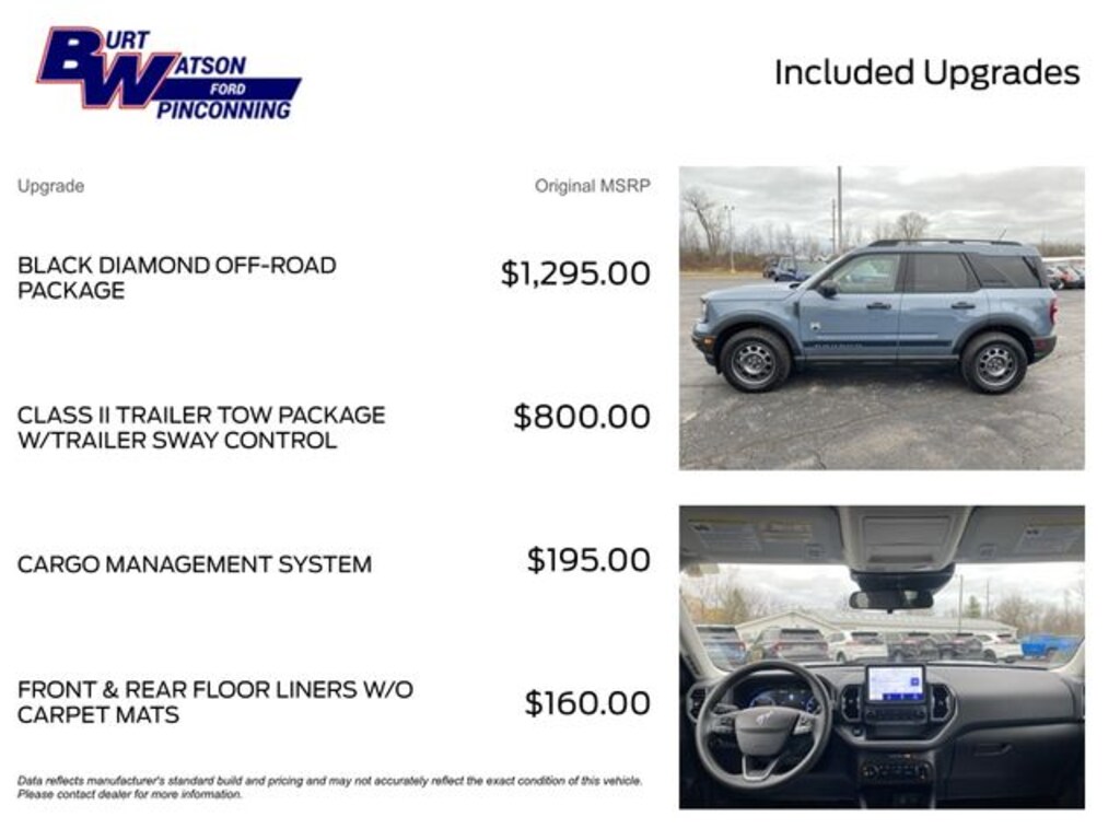 *** Price Includes Qualified Trade In *** Price includes: A/Z Pricing, $1000 - Ford Retail Order Bonus Cash Certificate. Exp. 01/05/2026 $3000 - Model Year Closeout Bonus Cash - Bronco Sport. Exp. 11/03/2025 $750 - 2024 College Student Recognition Exclusive Cash Reward Pgm. Exp. 01/05/2026