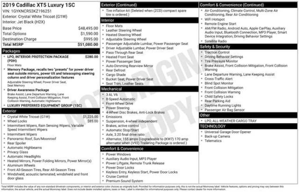 **APPLE CAR PLAY**, **Bluetooth, Hands-Free**, **Rear Backup Camera**, **Heated Seats**, 1st oil change free with purchase, 2 Key Fobs, All weather floor matts, Heated Seats, In-Vehicle Wi-Fi, Remote control start, Stolen vehicle location/ Recovery system, Driver monitoring system, Vehicle Usage Alerts, In-vehicle virtual assistant, Vehicle usage alerts, 155 Amp Alternator, 4-Wheel Independent Suspension, 8-Way Power Front Passenger Seat Adjuster, All-Weather Cargo Tray (LPO), All-Weather Floor Mats, Alloy wheels, Apple CarPlay/Android Auto, Automatic Dual-Zone Climate Control, Body-Color Heated Power-Adjustable Outside Mirrors, Garage door transmitter, Halogen Headlamps, Heated door mirrors, Heated steering wheel, Illuminated entry, Interior Protection Package (LPO), Leather Seating Surfaces w/Mini Perforated Inserts, Luxury Package 1SC, Memory seat, Power driver seat, Power moonroof: UltraView, Teen Driver, Wheel Locks, Wheels: 18 x 8 Bright Machined Faced Aluminum, 2-Way Power Driver Lumbar Control Seat Adjuster, 2-Way Power Passenger Lumbar Control Seat Adjuster, 3.20 Axle Ratio, 4-Wheel Disc Brakes, 8 Speakers, ABS brakes, Air Conditioning, AM/FM radio: SiriusXM, Auto High-beam Headlights, Auto-dimming door mirrors, Auto-dimming Rear-View mirror, Automatic temperature control, Bodyside moldings, Bose Premium 8-Speaker Audio System Feature, Brake assist, Bumpers: body-color, Compass, Delay-off headlights, Driver & Front Passenger Heated Seats, Driver door bin, Driver vanity mirror, Dual front impact airbags, Dual front side impact airbags, Electronic Stability Control, Emergency communication system: OnStar and Cadillac connected services capable, Exterior Parking Camera Rear, Four wheel independent suspension, Front anti-roll bar, Front Bucket Seats, Front Center Armrest, Front dual zone A/C, Front reading lights, Fully automatic headlights, Heated front seats, Knee airbag, Leather steering wheel, Low tire pressure warning, Occupant sensing airbag, Outside temperature display, Overhead airbag, Overhead console, Panic alarm, Passenger door bin, Passenger vanity mirror, Power door mirrors, Power Liftgate, Power passenger seat, Power steering, Power windows, Radio data system, Radio: Cadillac User Experience AM/FM Stereo, Rain sensing wipers, Rear anti-roll bar, Rear reading lights, Rear seat center armrest, Rear window defroster, Rear window wiper, Remote keyless entry, Roof rack: rails only, SiriusXM Radio, Speed control, Speed-sensing steering, Split folding rear seat, Spoiler, Steering wheel memory, Steering wheel mounted audio controls, Tachometer, Telescoping steering wheel, Tilt steering wheel, Traction control, Trip computer, Variably intermittent wipers, Voltmeter, 155 Amp Alternator, 4-Wheel Independent Suspension, 8-Way Power Front Passenger Seat Adjuster, All-Weather Cargo Tray (LPO), All-Weather Floor Mats, Alloy wheels, Apple CarPlay/Android Auto, Automatic Dual-Zone Climate Control, Body-Color Heated Power-Adjustable Outside Mirrors, Garage door transmitter, Halogen Headlamps, Heated door mirrors, Heated steering wheel, Illuminated entry, Interior Protection Package (LPO), Leather Seating Surfaces w/Mini Perforated Inserts, Luxury Package 1SC, Memory seat, Power driver seat, Power moonroof: UltraView, Teen Driver, Wheel Locks, Wheels: 18 x 8 Bright Machined Faced Aluminum.