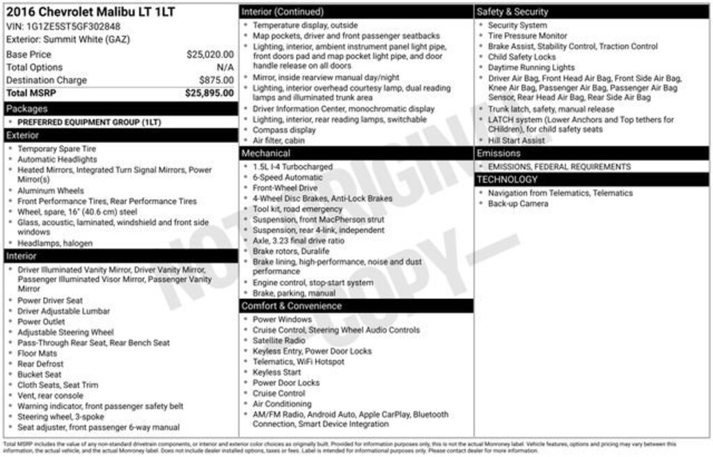 Summit White 2016 Chevrolet Malibu LT 1LT 1.5L DOHC 6-Speed Automatic FWD 4D Sedan