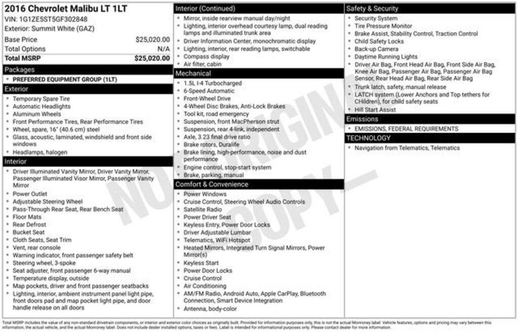 Recent Arrival!*** WE DELIVER ***Summit White 2016 Chevrolet Malibu LT 1LT 1.5L DOHC 6-Speed Automatic FWD 4D Sedan17 Aluminum Wheels, 4-Wheel Disc Brakes, 6 Speakers, 8-Way Power Driver Seat Adjuster, ABS brakes, Air Conditioning, Alloy wheels, AM/FM radio: SiriusXM, Apple CarPlay/Android Auto, Brake assist, Bumpers: body-color, Compass, Delay-off headlights, Driver door bin, Driver vanity mirror, Dual front impact airbags, Dual front side impact airbags, Electronic Stability Control, Emergency communication system: OnStar, Exterior Parking Camera Rear, Four wheel independent suspension, Front anti-roll bar, Front Bucket Seats, Front Center Armrest w/Storage, Front Passenger 6-Way Manual Seat Adjuster, Front reading lights, Fully automatic headlights, Heated door mirrors, Illuminated entry, Knee airbag, Low tire pressure warning, Occupant sensing airbag, Outside temperature display, Overhead airbag, Overhead console, Panic alarm, Passenger door bin, Passenger vanity mirror, Power door mirrors, Power Driver Lumbar Control Seat Adjuster, Power driver seat, Power steering, Power windows, Preferred Equipment Group 1LT, Premium Cloth Seat Trim, Radio data system, Radio: AM/FM Stereo w/Seek-and-Scan/Digital Clock, Rear anti-roll bar, Rear reading lights, Rear seat center armrest, Rear side impact airbag, Rear window defroster, Remote keyless entry, Security system, SiriusXM Satellite Radio, Speed control, Split folding rear seat, Steering wheel mounted audio controls, Tachometer, Telescoping steering wheel, Tilt steering wheel, Traction control, Trip computer, Turn signal indicator mirrors, Variably intermittent wipers.