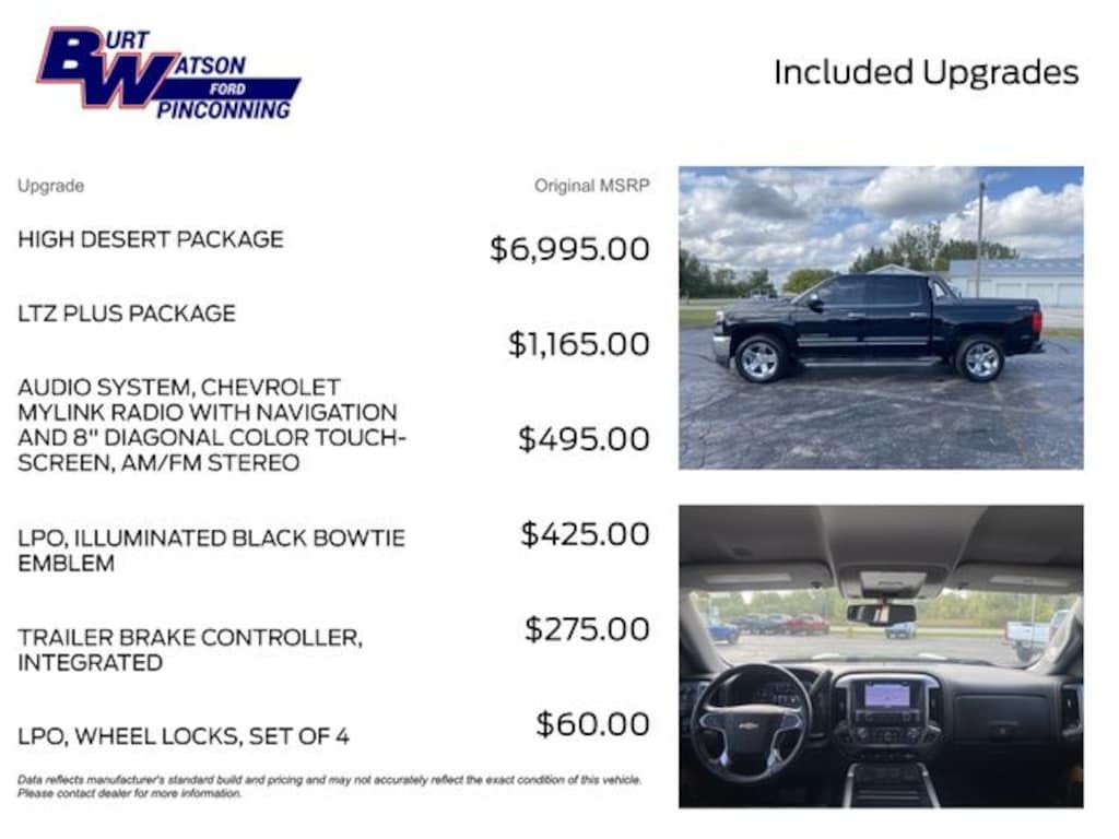 172 point inspection certified, 1st oil change free with purchase, 2 Key Fobs, Ceramic coating available on all purchases at discounted pricing, service report available, Heated Seats, Digital Key, In-Vehicle Wi-Fi, Stolen vehicle location/ recovery system, 110-Volt AC Power Outlet, 150 Amp Alternator, 4.2" Diagonal Color Display Driver Info Center, 4" Black Round Assist Steps (LPO), 6 Speaker Audio System, 6" Rectangular Chromed Tubular Assist Steps, All-Weather Floor Liner (LPO), Auto-Dimming Inside Rear-View Mirror, Auxiliary External Transmission Oil Cooler, Black Pack (LPO), Bluetooth® For Phone, Chrome Bodyside Moldings, Chrome Cap Power-Adjustable Heated Outside Mirrors, Chrome Door Handles, Chrome Grille Surround, Chrome Mirror Caps, Color-Keyed Carpeting w/Rubberized Vinyl Floor Mats, Deep-Tinted Glass, Driver & Front Passenger Illuminated Vanity Mirrors, Dual-Zone Automatic Climate Control, Electric Rear-Window Defogger, EZ Lift & Lower Tailgate, Floor Mounted Console, Front & Rear Black Bowtie Emblems (LPO), Front Chrome Bumper, Front Frame-Mounted Black Recovery Hooks, Front Full Feature Power Reclining Bucket Seats, Hard Tonneau Cover, HD Radio, Heated & Vented Front Seating, Heated Driver & Front Passenger Seats, Heavy-Duty Rear Locking Differential, High Desert Package, Leather Wrapped Heated Steering Wheel, Leather Wrapped Steering Wheel w/Cruise Controls, LED Taillamps w/Signature, Lighted Side Box Storage, LTZ Plus Package, Manual Tilt/Telescoping Steering Column, Navigation System, OnStar 3 Months Guidance Plan, OnStar w/4G LTE, Pickup Box Rail Caps Delete, Pickup Tailgate Upper Molding Delete, Power Adjustable Pedals, Power Sliding Rear Window, Power Windows w/Driver Express Up, Preferred Equipment Group 1LZ, Rear 60/40 Folding Bench Seat (Folds Up), Rear Chrome Bumper, Rear Vision Camera, Rear Wheelhouse Liners, Remote Keyless Entry, Remote Locking Tailgate, Remote Vehicle Starter System, Single Slot CD/MP3 Player, Steering Wheel Audio Controls, Theft Deterrent System (Unauthorized Entry), Thin Profile LED Fog Lamps, Trailering Package, Universal Home Remote, Wheels: 22" 5-Spoke High Gloss Black (LPO), Wheels: 22" x 9" Steel Interim (LPO), Wireless Charging, 3.42 Rear Axle Ratio, 4-Wheel Disc Brakes, 40/20/40 Front Split Bench Seat, 6 Speakers, ABS brakes, Air Conditioning, Alloy wheels, AM/FM radio: SiriusXM, Auto-dimming door mirrors, Auto-dimming Rear-View mirror, Automatic temperature control, Bodyside moldings, Bose Speaker System, Brake assist, CD player, Compass, Delay-off headlights, Driver door bin, Driver vanity mirror, Dual front impact airbags, Dual front side impact airbags, Electronic Stability Control, Emergency communication system: OnStar Guidance, Exterior Parking Camera Rear, Front anti-roll bar, Front Center Armrest w/Storage, Front dual zone A/C, Front fog lights, Front reading lights, Front wheel independent suspension, Fully automatic headlights, Garage door transmitter, Heated door mirrors, Heated front seats, Illuminated Black Bowtie Emblem (LPO), Illuminated entry, Integrated Trailer Brake Controller, Leather Appointed Seat Trim, Low tire pressure warning, Memory seat, Occupant sensing airbag, Outside temperature display, Overhead airbag, Overhead console, Panic alarm, Passenger door bin, Passenger vanity mirror, Power door mirrors, Power driver seat, Power passenger seat, Power steering, Power windows, Premium audio system: Chevrolet MyLink, Radio data system, Radio: AM/FM 8" Diagonal Clr Touch Nav, Radio: AM/FM 8" Diagonal Color Touch Screen, Rear reading lights, Rear seat center armrest, Rear step bumper, Rear window defroster, Remote keyless entry, Security system, SiriusXM Satellite Radio, Speed control, Speed-sensing steering, Split fol