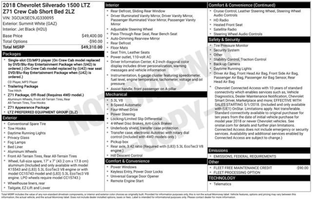 Recent Arrival! Clean CARFAX.*** WE DELIVER ***Summit White 2018 Chevrolet Silverado 1500 LTZ 2LZ 4D Crew Cab EcoTec3 5.3L V8 8-Speed Automatic with Overdrive 4WD110-Volt AC Power Outlet, 150 Amp Alternator, 3.42 Rear Axle Ratio, 4-Wheel Disc Brakes, 4.2 Diagonal Color Display Driver Info Center, 40/20/40 Front Split Bench Seat, 6 Speaker Audio System, 6 Speakers, ABS brakes, Air Conditioning, Alloy wheels, AM/FM radio: SiriusXM, Auto-dimming door mirrors, Auto-Dimming Inside Rear-View Mirror, Auto-dimming Rear-View mirror, Automatic temperature control, Auxiliary External Transmission Oil Cooler, Bluetooth® For Phone, Bodyside moldings, Brake assist, CD player, Chevrolet Connected Access, Chevrolet w/4G LTE, Chrome Bodyside Moldings, Chrome Cap Power-Adjustable Heated Outside Mirrors, Chrome Door Handles, Chrome Mirror Caps, Color-Keyed Carpeting w/Rubberized Vinyl Floor Mats, Compass, Deep-Tinted Glass, Delay-off headlights, Driver & Front Passenger Illuminated Vanity Mirrors, Driver door bin, Driver vanity mirror, Dual front impact airbags, Dual front side impact airbags, Dual-Zone Automatic Climate Control, Electric Rear-Window Defogger, Electronic Stability Control, Exterior Parking Camera Rear, EZ Lift & Lower Tailgate, Front anti-roll bar, Front Center Armrest w/Storage, Front Chrome Bumper, Front dual zone A/C, Front fog lights, Front Frame-Mounted Black Recovery Hooks, Front reading lights, Front wheel independent suspension, Fully automatic headlights, Garage door transmitter, HD Radio, Heated door mirrors, Heated Driver & Front Passenger Seats, Heated front seats, Heavy-Duty Rear Locking Differential, Illuminated entry, Leather Appointed Seat Trim, Leather Wrapped Steering Wheel w/Cruise Controls, LED Taillamps w/Signature, Low tire pressure warning, Manual Tilt/Telescoping Steering Column, Memory seat, Occupant sensing airbag, OnStar & Chevrolet Connected Services Capable, Outside temperature display, Overhead airbag, Overhead console, Panic alarm, Passenger door bin, Passenger vanity mirror, Power door mirrors, Power driver seat, Power passenger seat, Power Sliding Rear Window, Power steering, Power windows, Power Windows w/Driver Express Up, Premium audio system: Chevrolet MyLink, Radio data system, Radio: AM/FM 8 Diagonal Color Touch Screen, Rear 60/40 Folding Bench Seat (Folds Up), Rear Chrome Bumper, Rear reading lights, Rear seat center armrest, Rear step bumper, Rear Wheelhouse Liners, Rear window defroster, Remote Keyless Entry, Remote keyless entry, Remote Locking Tailgate, Remote Vehicle Starter System, Security system, Single Slot CD/MP3 Player, SiriusXM Satellite Radio, Speed control, Speed-sensing steering, Split folding rear seat, Spray-On Pickup Box Bed Liner, Steering Wheel Audio Controls, Steering wheel mounted audio controls, Tachometer, Telescoping steering wheel, Theft Deterrent System (Unauthorized Entry), Thin Profile LED Fog Lamps, Tilt steering wheel, Traction control, Trailering Package, Trip computer, Turn signal indicator mirrors, Universal Home Remote, Variably intermittent wipers, Voltmeter.