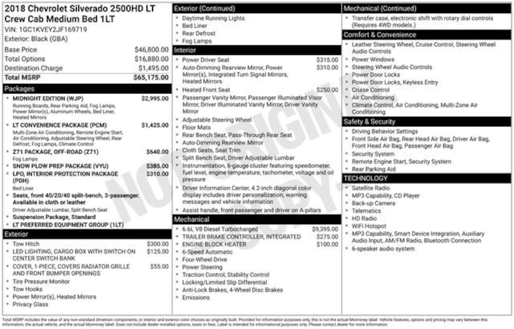 Recent Arrival! CARFAX One-Owner.*** WE DELIVER ***Black 2018 Chevrolet Silverado 2500HD LT 4D Crew Cab Duramax 6.6L V8 Turbodiesel Allison 1000 6-Speed Automatic 4WD**ONE OWNER**, 172 point inspection certified, 1st oil change free with purchase, Heated Seats, In-Vehicle Wi-Fi, Remote control start, Stolen vehicle location/ Recovery system, Driver monitoring system, Vehicle Usage Alerts, In-vehicle virtual assistant, Vehicle usage alerts, 1-Piece Radiator Grille/Front Bumper Opening Cover, 10-Way Power Driver's Seat Adjuster, 110-Volt AC Power Outlet, 17 Machined Aluminum Wheels, 220 Amps Alternator, 4-Wheel Disc Brakes, 4.2 Diagonal Color Display Driver Info Center, 4 Round Black Assist Steps (LPO), 6 Speakers, 6-Speaker Audio System, ABS brakes, Air Conditioning, All-Weather Floor Liner (LPO), Alloy wheels, AM/FM radio: SiriusXM, Auto-Dimming Inside Rear-View Mirror, Black Power-Adjustable Heated Outside Mirrors, Body Color Door Handles, Body-Color Bodyside Moldings, Body-Color Front Bumper, Body-Color Grille w/Chrome Bars, Body-Color Mirror Caps, Body-Color Power-Adjustable Heated Outside Mirrors, Body-Color Rear Bumper, Bodyside moldings, Brake assist, Bumpers: chrome, CD player, Chevrolet Connected Access, Chevrolet w/4G LTE, Cloth Seat Trim, Color-Keyed Carpeting Floor Covering, Compass, Deep-Tinted Glass, Delay-off headlights, Digital Steering Assist, Driver & Front Passenger Vanity Mirror Visors, Driver door bin, Driver vanity mirror, Dual front impact airbags, Dual front side impact airbags, Dual-Zone Automatic Climate Control, Electric Rear-Window Defogger, Electronic Shift Transfer Case, Electronic Stability Control, Engine Block Heater, Exhaust Brake, Exterior Parking Camera Rear, EZ-Lift & Lower Tailgate, Front & Rear Black Bow Tie, Front 40/20/40 Reclining Split-Bench Seat, Front anti-roll bar, Front Center Armrest w/Storage, Front Halogen Fog Lamps, Front reading lights, Front wheel independent suspension, Fully automatic headlights, HD Radio, Heated door mirrors, Heated Driver & Front Passenger Seating, Hill Descent Control, Illuminated entry, Integrated Trailer Brake Controller, Interior Protection Package (LPO) (DISC), Leather-Wrapped Steering Wheel, LED Cargo Box Lighting, Low tire pressure warning, LT Convenience Package, Manual Tilt-Wheel/Telescoping Steering Column, Midnight Edition, Occupant sensing airbag, Off-Road Z71 Package, OnStar & Chevrolet Connected Services Capable, Outside temperature display, Overhead airbag, Overhead console, Panic alarm, Passenger door bin, Passenger vanity mirror, Power door mirrors, Power steering, Power windows, Power Windows w/Driver Express Up & Down, Preferred Equipment Group 1LT, Premium audio system: Chevrolet MyLink, Provision for Cab Roof-Mounted Lamp/Beacon, Radio: AM/FM Stereo w/Chevrolet MyLink, Rear 60/40 Folding Bench Seat (Folds Up), Rear reading lights, Rear seat center armrest, Rear step bumper, Rear Wheelhouse Liners, Remote Keyless Entry, Remote keyless entry, Remote Locking Tailgate, Remote Vehicle Starter System, Rubber Bed Mat, Single Slot CD/MP3 Player, SiriusXM Satellite Radio, Snow Plow Prep Package, Speed control, Speed-sensing steering, Split folding rear seat, Spray-On Pickup Box Bed Liner w/Bowtie Logo, Standard Suspension Package, Steering Wheel Audio Controls, Steering wheel mounted audio controls, Tachometer, Tilt steering wheel, Traction control, Trailering Equipment, Trip computer, Ultrasonic Front & Rear Park Assist, Unauthorized Entry Theft-Deterrent System, Variably intermittent wipers, Voltmeter, Wheels: 18 Black Aluminum, 1-Piece Radiator Grille/Front Bumper Opening Cover, 10-Way Power Driver's Seat Adjuster, 110-Volt AC Power Outlet, 17 Machined Aluminum Wheels, 220 Amps Alternator, 4-Wheel Disc Brakes, 4.2 Diagonal Color Display Driver Info Center, 4 Round Black Assist Steps (LPO), 6 Speakers, 6-Speaker Audio System, ABS brakes, Air Conditioning, All-Weather Floor Liner (LPO), Alloy wheels, AM/FM r