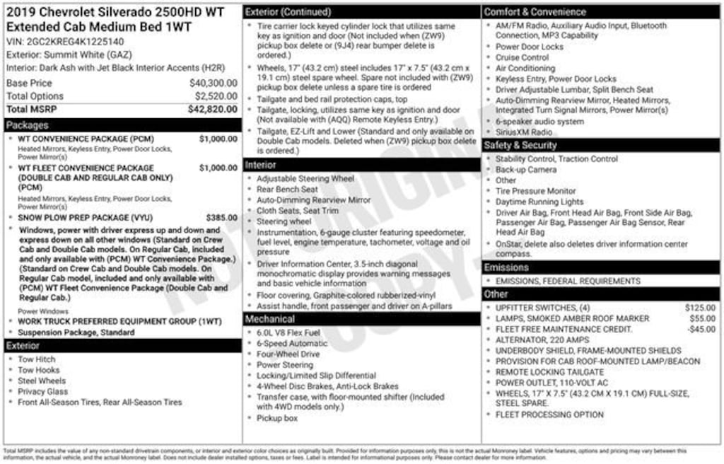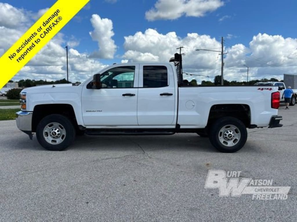 CARFAX One-Owner. Clean CARFAX. Odometer is 74315 miles below market average!*** WE DELIVER ***Summit White 2019 Chevrolet Silverado 2500HD Work Truck 4D Double Cab Vortec 6.0L V8 SFI Flex Fuel VVT 6-Speed Automatic HD Electronic with Overdrive 4WD110-Volt AC Power Outlet, 17 Steel Wheels, 220 Amps Alternator, 4 Upfitter Switches, 4-Wheel Disc Brakes, 4.10 Rear Axle Ratio, 6 Speakers, ABS brakes, Air Conditioning, AM/FM radio, Auto-Dimming Inside Rear-View Mirror, Black Power-Adjustable Heated Outside Mirrors, Brake assist, Bumpers: chrome, Cloth Seat Trim, Deep-Tinted Glass, Delay-off headlights, Driver door bin, Dual front impact airbags, Dual front side impact airbags, Electronic Stability Control, Exterior Parking Camera Rear, Front 40/20/40 Reclining Split-Bench Seat, Front anti-roll bar, Front Center Armrest w/Storage, Front reading lights, Front wheel independent suspension, Fully automatic headlights, Low tire pressure warning, Occupant sensing airbag, Overhead airbag, Overhead console, Passenger door bin, Passenger vanity mirror, Power steering, Power windows, Preferred Equipment Group 1WT, Premium audio system: Chevrolet Infotainment System, Provision for Cab Roof-Mounted Lamp/Beacon, Radio: Chevrolet Infotainment System, Rear Full-Width Folding Bench Seat, Rear reading lights, Rear step bumper, Remote Keyless Entry, Remote Locking Tailgate, Smoked Amber Roof Marker Lamps, Snow Plow Prep Package, Speed control, Standard Suspension Package, Steering Wheel, Tachometer, Tilt steering wheel, Traction control, Trip computer, Variably intermittent wipers, Voltmeter, WT Convenience Package.