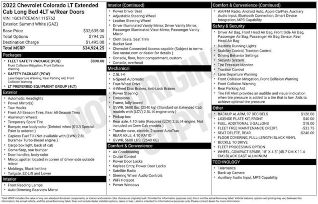 Recent Arrival! Clean CARFAX.*** WE DELIVER ***Summit White 2022 Chevrolet Colorado LT 2.5L I4 DI DOHC VVT 6-Speed Automatic 4WD4-Wheel Disc Brakes, 4.10 Rear Axle Ratio, 6 Speakers, 6-Speaker Audio System Feature, ABS brakes, Air Conditioning, Alloy wheels, AM/FM radio: SiriusXM, Apple CarPlay/Android Auto, Auto-dimming Rear-View mirror, Bumpers: body-color, Cloth Seat Trim, Compass, Delay-off headlights, Driver 6-Way Power Seat Adjuster, Driver door bin, Driver vanity mirror, Dual front impact airbags, Dual front side impact airbags, Electronic Stability Control, Enhanced Driver Instrument Information Display, Exterior Parking Camera Rear, Forward Collision Alert, Front anti-roll bar, Front Bucket Seats, Front Center Armrest, Front License Plate Kit, Front reading lights, Front wheel independent suspension, Fully automatic headlights, Illuminated entry, Lane Departure Warning System, Low tire pressure warning, Occupant sensing airbag, Outside temperature display, Overhead airbag, Overhead console, Panic alarm, Passenger door bin, Passenger vanity mirror, Power door mirrors, Power driver seat, Power steering, Power windows, Preferred Equipment Group 4LT, Premium audio system: Chevrolet Infotainment 3, Radio data system, Radio: Chevrolet Infotainment 3 System, Rear step bumper, Rear Vision Camera, Remote keyless entry, Safety Package, Security system, SiriusXM Radio, Speed control, Speed-sensing steering, Split folding rear seat, Steering wheel mounted audio controls, Tachometer, Telescoping steering wheel, Tilt steering wheel, Traction control, Trip computer, Ultrasonic Rear Park Assist, Variably intermittent wipers, Wheels: 17 x 8 Blade Silver Metallic Cast Alloy.