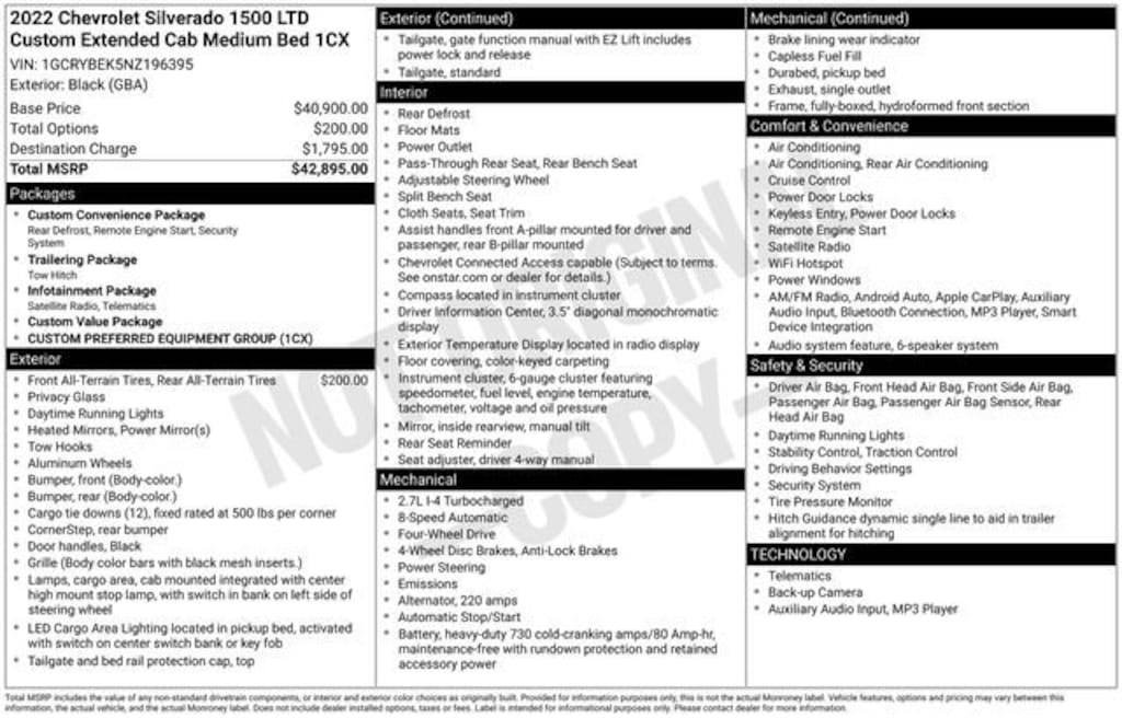 3.42 Rear Axle Ratio, 3.5 Monochromatic Display Driver Info Center, 4-Wheel Disc Brakes, 40/20/40 Front Split Bench Seat, 6 Speakers, 6-Speaker Audio System, ABS brakes, Air Conditioning, Alloy wheels, AM/FM radio: SiriusXM, Apple CarPlay/Android Auto, Bluetooth® For Phone, Body Color Grille, Brake assist, Bumpers: body-color, Chevrolet Connected Access Capable, Cloth Seat Trim, Color-Keyed Carpeting Floor Covering, Compass, Custom Convenience Package, Custom Value Package, Deep-Tinted Glass, Delay-off headlights, Driver door bin, Driver vanity mirror, Dual front impact airbags, Dual front side impact airbags, Electric Rear-Window Defogger, Electronic Cruise Control, Electronic Stability Control, EZ Lift Power Lock & Release Tailgate, Front anti-roll bar, Front Center Armrest w/Storage, Front Frame-Mounted Black Recovery Hooks, Front reading lights, Front Rubberized Vinyl Floor Mats, Front wheel independent suspension, Fully automatic headlights, Heated door mirrors, Heavy Duty Suspension, Hitch Guidance, Illuminated entry, Infotainment Package, LED Cargo Area Lighting, Low tire pressure warning, Manual Tilt Wheel Steering Column, Occupant sensing airbag, OnStar & Chevrolet Connected Services Capable, Outside temperature display, Overhead airbag, Overhead console, Panic alarm, Passenger door bin, Passenger vanity mirror, Power Door Locks, Power door mirrors, Power Front Windows w/Driver Express Up/Down, Power Front Windows w/Passenger Express Down, Power Rear Windows w/Express Down, Power steering, Power windows, Preferred Equipment Group 1CX, Premium audio system: Chevrolet Infotainment 3, Radio data system, Radio: Chevrolet Infotainment 3 System, Rear 60/40 Folding Bench Seat (Folds Up), Rear reading lights, Rear Rubberized-Vinyl Floor Mats, Rear step bumper, Rear window defroster, Remote Keyless Entry, Remote keyless entry, Remote Vehicle Starter System, Security system, SiriusXM Radio, Speed control, Speed-sensing steering, Split folding rear seat, Standard Tailgate, Tachometer, Theft Deterrent System (Unauthorized Entry), Tilt steering wheel, Traction control, Trailering Package, Trip computer, Variably intermittent wipers, Voltmeter, Wheels: 20 x 9 Bright Silver Painted Aluminum, Wi-Fi Hot Spot Capable.