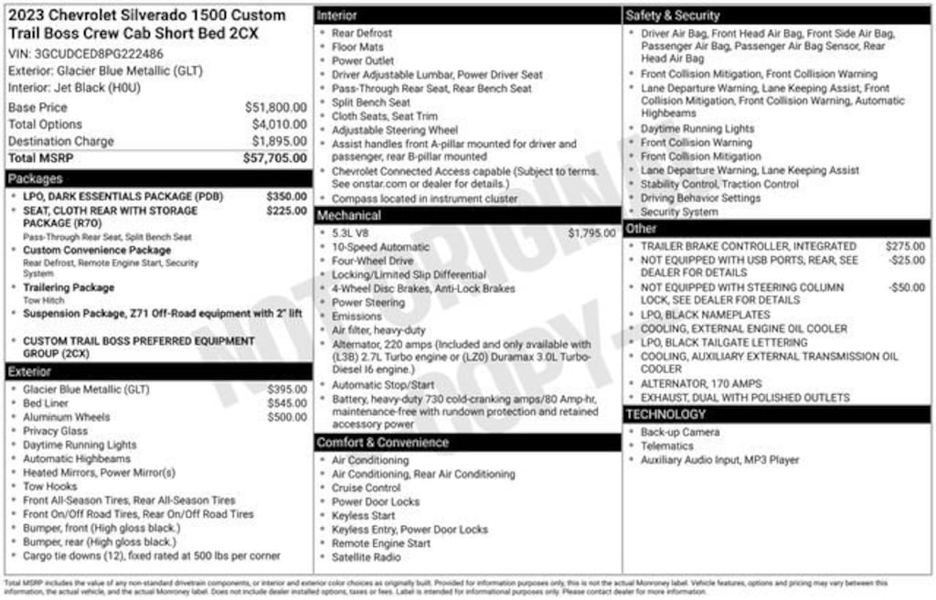 Recent Arrival! CARFAX One-Owner. Clean CARFAX.*** WE DELIVER ***Glacier Blue Metallic 2023 Chevrolet Silverado 1500 Custom Trail Boss 4D Crew Cab EcoTec3 5.3L V8 10-Speed Automatic 4WD10-Way Power Driver Seat w/Lumbar, 120-Volt Bed Mounted Power Outlet, 120-Volt Instrument Panel Power Outlet, 170 Amp Alternator, 220 Amp Alternator, 3.5 Monochromatic Display Driver Info Center, 4-Wheel Disc Brakes, 40/20/40 Front Split-Bench Seat, 6 Speakers, 6-Speaker Audio System, ABS brakes, Air Conditioning, Alloy wheels, AM/FM radio: SiriusXM, Apple CarPlay/Android Auto, Auto High-beam Headlights, Auto-Locking Rear Differential, Automatic Emergency Braking, Auxiliary External Transmission Oil Cooler, Black Name Plates (LPO), Black Tailgate CHEVROLET Lettering (LPO), Bluetooth® For Phone, Brake assist, Chevrolet Connected Access Capable, Chevytec Spray-On Black Bedliner, Cloth Rear Seat w/Storage Package, Cloth Seat Trim, Color-Keyed Carpeting Floor Covering, Compass, Custom Convenience Package, Dark Essentials Package (LPO), Deep-Tinted Glass, Delay-off headlights, Driver door bin, Driver vanity mirror, Dual Exhaust w/Polished Outlets, Dual front impact airbags, Dual front side impact airbags, Dual Rear USB Ports (Charge Only), Electric Rear-Window Defogger, Electrical Steering Column Lock, Electronic Cruise Control, Electronic Stability Control, External Engine Oil Cooler, EZ Lift Power Lock & Release Tailgate, Following Distance Indicator, Forward Collision Alert, Front anti-roll bar, Front Center Armrest w/Storage, Front Pedestrian Braking, Front reading lights, Front Rubberized Vinyl Floor Mats, Front wheel independent suspension, Fully automatic headlights, HD Rear Vision Camera, Heated door mirrors, Heavy-Duty Air Filter, Hill Descent Control, Hitch Guidance, Illuminated entry, Integrated Trailer Brake Controller, IntelliBeam Automatic High Beam On/Off, Lane Keep Assist w/Lane Departure Warning, LED Cargo Area Lighting, Low tire pressure warning, Manual Tilt Wheel Steering Column, Not Equipped w/Rear USB Ports, Not Equipped w/Steering Column Lock, Occupant sensing airbag, OnStar & Chevrolet Connected Services Capable, Outside temperature display, Overhead airbag, Overhead console, Panic alarm, Passenger door bin, Passenger vanity mirror, Performance Red Recovery Hooks, Power door mirrors, Power driver seat, Power Front Windows w/Driver Express Up/Down, Power Front Windows w/Passenger Express Down, Power Rear Windows w/Express Down, Power steering, Power windows, Preferred Equipment Group 2CX, Premium audio system: Chevrolet Infotainment 3, Radio data system, Radio: Chevrolet Infotainment 3 System, Rear 60/40 Folding Bench Seat (Folds Up), Rear reading lights, Rear Rubberized-Vinyl Floor Mats, Rear step bumper, Rear window defroster, Remote Keyless Entry, Remote keyless entry, Remote Vehicle Starter System, Security system, SiriusXM Radio, Speed control, Speed-sensing steering, Split folding rear seat, Standard Tailgate, Suspension Package, Tachometer, Theft Deterrent System (Unauthorized Entry), Tilt steering wheel, Traction control, Trailering Package, Trip computer, Variably intermittent wipers, Voltmeter, Wheels: 18 x 8.5 Black Painted Aluminum, Wheels: 20 x 9 High Gloss Black Painted Alum, Wi-Fi Hot Spot Capable, Wireless Phone Projection.