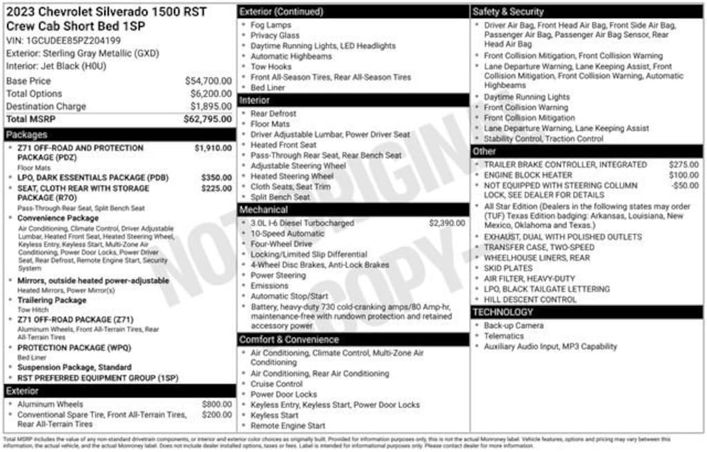 Recent Arrival! CARFAX One-Owner. Clean CARFAX. Odometer is 17293 miles below market average! Priced below KBB Fair Purchase Price!*** WE DELIVER ***Sterling Gray Metallic 2023 Chevrolet Silverado 1500 RST 4D Crew Cab 3.0L I6 10-Speed Automatic 4WD**APPLE CAR PLAY**, **Rear Backup Camera**, **Heated Seats**, 172 point inspection certified, 1st oil change free with purchase, 2 Key Fobs, All weather floor matts, Heated Seats, In-Vehicle Wi-Fi, Remote control start, Stolen vehicle location/ Recovery system, Driver monitoring system, Vehicle Usage Alerts, In-vehicle virtual assistant, Vehicle usage alerts, 10-Way Power Driver Seat w/Lumbar, 12.3 Multicolor Reconfigurable Digital Display, 120-Volt Bed Mounted Power Outlet, 120-Volt Instrument Panel Power Outlet, 220 Amp Alternator, 3.23 Rear Axle Ratio, 6-Speaker Audio System, All-Star Edition, All-Weather Floor Liner (LPO) (AAK), Auto-Locking Rear Differential, Black Name Plates (LPO), Black Tailgate CHEVROLET Lettering (LPO), Bluetooth® For Phone, Chevrolet Connected Access Capable, Chevytec Spray-On Black Bedliner, Cloth Rear Seat w/Storage Package, Color-Keyed Carpeting Floor Covering, Compass, Convenience Package, Dark Essentials Package (LPO), Deep-Tinted Glass, Dual Exhaust w/Polished Outlets, Dual Rear USB Ports (Charge Only), Dual-Zone Automatic Climate Control, Electric Rear-Window Defogger, Electrical Steering Column Lock, Electronic Cruise Control, EZ Lift Power Lock & Release Tailgate, Front Frame-Mounted Black Recovery Hooks, Front LED Fog Lamps, Front Rubberized Vinyl Floor Mats, HD Rear Vision Camera, Heated Driver & Front Outboard Passenger Seats, Heated front seats, Heated Power-Adjustable Outside Mirrors, Heated Steering Wheel, Heated steering wheel, Heavy-Duty Air Filter, High Capacity Suspension Package, High Gloss Black Mirror Caps, Hill Descent Control, Hitch Guidance, Inside Rear-View Mirror w/Tilt, Integrated Trailer Brake Controller, IntelliBeam Automatic High Beam On/Off, Keyless Open & Start, LED Cargo Area Lighting, Off-Road Suspension, OnStar & Chevrolet Connected Services Capable, Power Front Windows w/Driver Express Up/Down, Power Front Windows w/Passenger Express Down, Power Rear Windows w/Express Down, Preferred Equipment Group 1SP, Protection Package, Rear 60/40 Folding Bench Seat (Folds Up), Rear Rubberized-Vinyl Floor Mats, Rear Wheelhouse Liners, Remote Vehicle Starter System, SiriusXM w/360L, Standard Suspension Package, Standard Tailgate, Steering Wheel Audio Controls, Theft Deterrent System (Unauthorized Entry), Trailering Package, Wheels: 20 x 9 High Gloss Black Painted Alum, Wi-Fi Hot Spot Capable, Wireless Phone Projection, Wrapped Steering Wheel, Z71 Off-Road & Protection Package, Z71 Off-Road Package, 4-Wheel Disc Brakes, 40/20/40 Front Split-Bench Seat, 6 Speakers, ABS brakes, Air Conditioning, Alloy wheels, AM/FM radio: SiriusXM with 360L, Apple CarPlay/Android Auto, Auto High-beam Headlights, Automatic Emergency Braking, Automatic temperature control, Brake assist, Bumpers: body-color, Cloth Seat Trim, Delay-off headlights, Driver door bin, Driver vanity mirror, Dual front impact airbags, Dual front side impact airbags, Electronic Stability Control, Engine Block Heater, Following Distance Indicator, Forward Collision Alert, Front anti-roll bar, Front Center Armrest w/Storage, Front dual zone A/C, Front fog lights, Front Pedestrian Braking, Front reading lights, Front wheel independent suspension, Fully automatic headlights, Heated door mirrors, Illuminated entry, Lane Keep Assist w/Lane Departure Warning, Low tire pressure warning, Not Equipped w/Steering Column Lock, Occupant sensing airbag, Outside temperature display, Overhead airbag, Overhead console, Panic alarm, Passenger door bin, Passenger vanity mirror, Power door mirrors, Power driver seat, Power steering, Power windows, Premium audio system: Chevrolet Infotainment 3 Premium, Radio data system, Radio: Chevrolet Infotainment 3 Premium System,