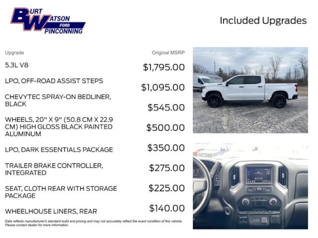 Pricing shown excludes tax, title, license, registration, or other applicable government fees. Any optional products, services, or accessories are also not reflected in the advertised price. At Burt Watson, it is our belief that every customer deserves a buying experience built on clarity and honesty. We're dedicated to doing business the right way, simply and transparently. While we make every effort to ensure the information on our site is accurate and up to date, occasional errors, omissions, or inaccuracies may occur. Additionally, there may be a delay between when a vehicle is sold and when our online inventory is updated. We encourage you to confirm all vehicle details and pricing directly with our team before purchase.