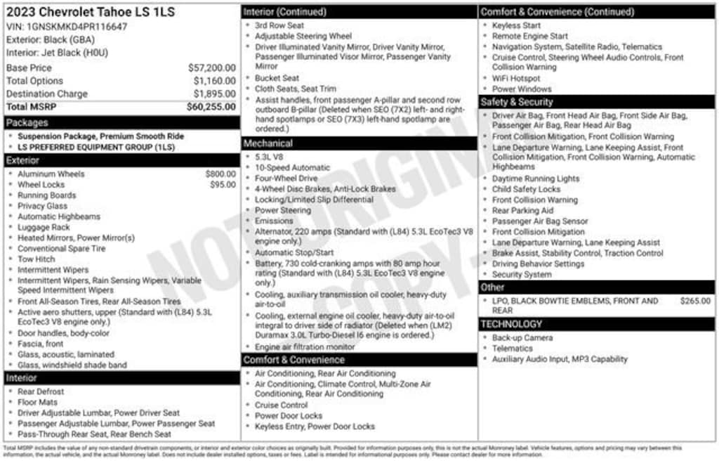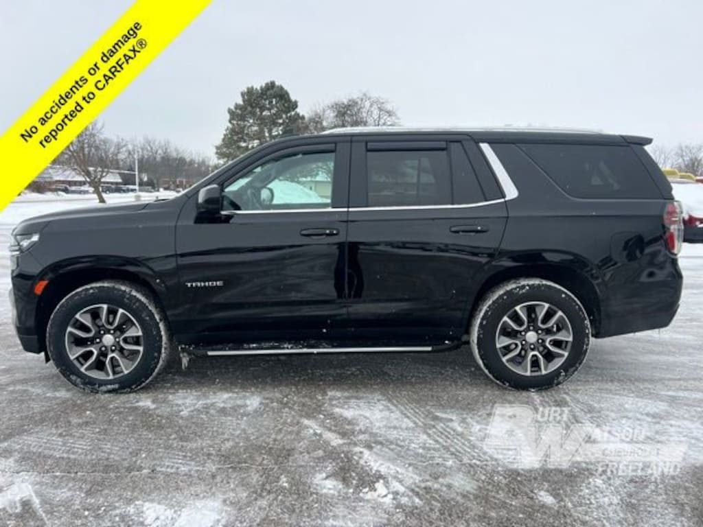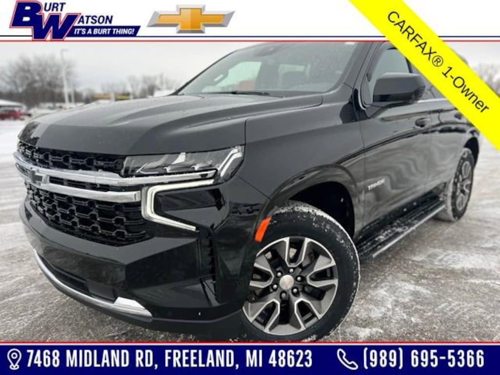 CARFAX One-Owner. Clean CARFAX. Odometer is 23716 miles below market average! Priced below KBB Fair Purchase Price!*** WE DELIVER ***Black 2023 Chevrolet Tahoe LS 4D Sport Utility EcoTec3 5.3L V8 10-Speed Automatic with Overdrive 4WD**APPLE CAR PLAY**, **Bluetooth, Hands-Free**, **Rear Backup Camera**, **Heated Seats**, 1st oil change free with purchase, 2 Key Fobs, All weather floor matts, Heated Seats, In-Vehicle Wi-Fi, Remote control start, Stolen vehicle location/ Recovery system, Driver monitoring system, Vehicle Usage Alerts, In-vehicle virtual assistant, Vehicle usage alerts, 1st & 2nd Row Color-Keyed Carpeted Floor Mats, 3.23 Rear Axle Ratio, 3rd row seats: split-bench, Apple CarPlay/Android Auto, Color-Keyed Carpeting Floor Covering, Driver & Front Outboard Passenger Airbags, Floor Console w/Storage Area, Front & Rear Black Bowtie Emblems (LPO), Front Bucket Seats, Front High-Back Reclining Bucket Seats, Heated door mirrors, LED Daytime Running Lamps, Power passenger seat, Preferred Equipment Group 1LS, Remote Start, Set of 4 Wheel Locks (LPO), SiriusXM Radio w/360L, Wheels: 20 x 9 Painted Aluminum, Wrapped Steering Wheel, 4-Wheel Disc Brakes, 6 Speakers, 6-Speaker Audio System Feature, ABS brakes, Air Conditioning, Alloy wheels, AM/FM radio: SiriusXM with 360L, Auto High-beam Headlights, Automatic temperature control, Brake assist, Bumpers: body-color, Compass, Delay-off headlights, Driver door bin, Driver vanity mirror, Dual front impact airbags, Dual front side impact airbags, Electronic Stability Control, Emergency communication system: OnStar and Chevrolet connected services capable, Four wheel independent suspension, Front anti-roll bar, Front Center Armrest, Front dual zone A/C, Front reading lights, Fully automatic headlights, Illuminated entry, Infotainment Display, Low tire pressure warning, Occupant sensing airbag, Outside temperature display, Overhead airbag, Overhead console, Panic alarm, Passenger door bin, Passenger vanity mirror, Power door mirrors, Power driver seat, Power steering, Power windows, Premium Cloth Seat Trim, Premium Smooth Ride Suspension, Radio: Chevrolet Infotainment 3 System, Rain sensing wipers, Rear air conditioning, Rear anti-roll bar, Rear reading lights, Rear seat center armrest, Rear window defroster, Rear window wiper, Remote keyless entry, Roof rack: rails only, Security system, Speed control, Speed-sensing steering, Split folding rear seat, Spoiler, Steering wheel mounted audio controls, Tachometer, Telescoping steering wheel, Tilt steering wheel, Traction control, Trip computer, Variably intermittent wipers, Voltmeter, 1st & 2nd Row Color-Keyed Carpeted Floor Mats, 3.23 Rear Axle Ratio, 3rd row seats: split-bench, Apple CarPlay/Android Auto, Color-Keyed Carpeting Floor Covering, Driver & Front Outboard Passenger Airbags, Floor Console w/Storage Area, Front & Rear Black Bowtie Emblems (LPO), Front Bucket Seats, Front High-Back Reclining Bucket Seats, Heated door mirrors, LED Daytime Running Lamps, Power passenger seat, Preferred Equipment Group 1LS, Remote Start, Set of 4 Wheel Locks (LPO), SiriusXM Radio w/360L, Wheels: 20 x 9 Painted Aluminum, Wrapped Steering Wheel.