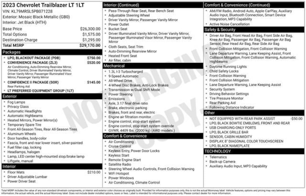 CARFAX One-Owner. Clean CARFAX. Odometer is 14969 miles below market average! Priced below KBB Fair Purchase Price!*** WE DELIVER ***Mosaic Black Metallic 2023 Chevrolet TrailBlazer LT 4D Sport Utility 1.3L Ecotec Turbo DOHC SIDI w/VVT 9-Speed Automatic AWD**APPLE CAR PLAY**, **Bluetooth, Hands-Free**, **ONE OWNER**, **Rear Backup Camera**, **Heated Seats**, 172 point inspection certified, 1st oil change free with purchase, 2 Key Fobs, All weather floor matts, Heated Seats, In-Vehicle Wi-Fi, Remote control start, Stolen vehicle location/ Recovery system, Driver monitoring system, Vehicle Usage Alerts, In-vehicle virtual assistant, Vehicle usage alerts, 1 Type-A & 1 Type-C USB Charging-Only Ports, 120-Volt Power Outlet, 8 Diagonal Color Touchscreen Display, Black Grille Bar (LPO), Black Nameplate (LPO), Blackout Package (LPO), Cabin Humidity Sensor, Confidence II Package, Convenience Package, Driver & Front Passenger Illuminated Vanity Mirrors, Front & Rear All-Weather Floor Liners (LPO), Front & Rear Black Bowtie Emblems (LPO), Front Bucket Seats, Heated door mirrors, Heated Driver & Front Passenger Seats, Heated front seats, Inside Rear-View Auto-Dimming Mirror, Preferred Equipment Group 1LT, Rear Park Assist, Single-Zone Auto Climate Control Air Conditioning, Wheels: 17 High Gloss Black Machined Aluminum, Wireless Apple CarPlay/Android Auto, 2-Way Adjustable Front Head Restraints, 2-Way Power Driver Lumbar Seat Adjuster, 3.17 Axle Ratio, 4-Way Manual Front Passenger Seat Adjuster, 4-Wheel Disc Brakes, 6 Speakers, 6-Speaker Audio System Feature w/Amplifier, 7 Diagonal Color Touchscreen, 8-Way Power Driver Seat Adjuster, ABS brakes, Air Conditioning, Alloy wheels, AM/FM radio: SiriusXM, Auto High-beam Headlights, Brake assist, Bumpers: body-color, Cloth Seat Trim, Compass, Delay-off headlights, Driver door bin, Driver vanity mirror, Dual front impact airbags, Dual front side impact airbags, Electronic Stability Control, Emergency communication system: OnStar and Chevrolet connected services capable, Exterior Parking Camera Rear, Flat-Folding Front Passenger Seatback, Front anti-roll bar, Front Center Armrest, Front fog lights, Front reading lights, Front wheel independent suspension, Fully automatic headlights, Illuminated entry, Knee airbag, Low tire pressure warning, Not Equipped w/Rear Park Assist, Occupant sensing airbag, Overhead airbag, Overhead console, Panic alarm, Passenger door bin, Passenger vanity mirror, Power door mirrors, Power steering, Power windows, Radio data system, Radio: Chevrolet Infotainment 3 System, Rear side impact airbag, Rear window defroster, Rear window wiper, Remote keyless entry, Ride & Handling Suspension, Security system, SiriusXM Radio, Speed control, Split folding rear seat, Spoiler, Steering wheel mounted audio controls, Tachometer, Telescoping steering wheel, Tilt steering wheel, Traction control, Trip computer, Variably intermittent wipers, 1 Type-A & 1 Type-C USB Charging-Only Ports, 120-Volt Power Outlet, 8 Diagonal Color Touchscreen Display, Black Grille Bar (LPO), Black Nameplate (LPO), Blackout Package (LPO), Cabin Humidity Sensor, Confidence II Package, Convenience Package, Driver & Front Passenger Illuminated Vanity Mirrors, Front & Rear All-Weather Floor Liners (LPO), Front & Rear Black Bowtie Emblems (LPO), Front Bucket Seats, Heated door mirrors, Heated Driver & Front Passenger Seats, Heated front seats, Inside Rear-View Auto-Dimming Mirror, Preferred Equipment Group 1LT, Rear Park Assist, Single-Zone Auto Climate Control Air Conditioning, Wheels: 17 High Gloss Black Machined Aluminum, Wireless Apple CarPlay/Android Auto.