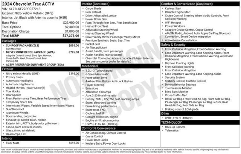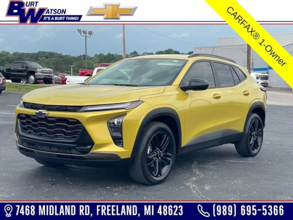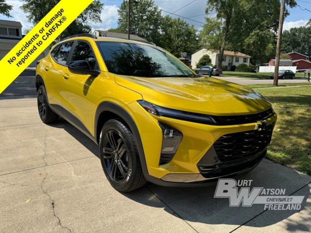 Recent Arrival! CARFAX One-Owner. Clean CARFAX. Odometer is 2650 miles below market average!*** WE DELIVER ***Nitro Yellow Metallic 2024 Chevrolet Trax ACTIV 4D Sport Utility 1.2L Ecotec Turbo DOHC DI w/VVT 6-Speed Automatic FWD2-Way Adjustable Front Head Restraints, 2-Way Power Driver Lumbar Seat Adjuster, 3.50 Final Drive Axle Ratio, 4-Way Manual Front Passenger Seat Adjuster, 4-Wheel Disc Brakes, 6 Speakers, 6-Speaker Audio System Feature, 8-Way Power Driver Seat Adjuster, ABS brakes, Adaptive Cruise Control, Air Conditioning, Alloy wheels, AM/FM radio: SiriusXM, Auto High-beam Headlights, Automatic temperature control, Brake assist, Bumpers: body-color, Compass, Delay-off headlights, Driver Confidence Package, Driver door bin, Driver vanity mirror, Dual front impact airbags, Dual front side impact airbags, Electronic Stability Control, Emergency communication system: OnStar and Chevrolet connected services capable, Evotex Seat Trim, Exterior Parking Camera Rear, Front & Rear All-Weather Floor Liners (LPO), Front anti-roll bar, Front Bucket Seats, Front Center Armrest, Front reading lights, Front wheel independent suspension, Fully automatic headlights, Heated door mirrors, Heated Driver & Front Passenger Seats, Heated front seats, Heated steering wheel, Illuminated entry, Lane Change Alert w/Side Blind Zone Alert, Low tire pressure warning, Occupant sensing airbag, Outside temperature display, Overhead airbag, Overhead console, Panic alarm, Passenger door bin, Passenger vanity mirror, Power door mirrors, Power driver seat, Power Sliding Glass Sunroof w/Manual Shade, Power steering, Power windows, Preferred Equipment Group 1SA, Premium audio system: Chevrolet Infotainment 3, Radio data system, Radio: Audio System w/AM/FM, Rear Cross-Traffic Alert, Rear Park Assist (DISC), Rear window defroster, Rear window wiper, Remote keyless entry, Security system, SiriusXM, Speed control, Split folding rear seat, Spoiler, Steering wheel mounted audio controls, Sunroof Package, Tachometer, Telescoping steering wheel, Tilt steering wheel, Traction control, Trip computer, Variably intermittent wipers, Wheels: 18 Black-Painted Aluminum, Wireless Charging.