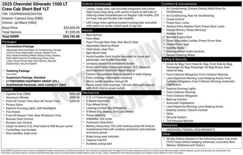 10-Way Power Driver Seat w/Lumbar, 12.3 Multicolor Reconfigurable Digital Display, 120-Volt Bed Mounted Power Outlet, 120-Volt Interior Power Outlet, 3.42 Rear Axle Ratio, 4-Wheel Disc Brakes, 6-Speaker Audio System, ABS brakes, Air Conditioning, All-Star Edition, AM/FM radio: SiriusXM with 360L, Apple CarPlay/Android Auto, Auto High-beam Headlights, Auto-Locking Rear Differential, Automatic Emergency Braking, Automatic temperature control, Bluetooth® For Phone, Brake assist, Chrome Mirror Caps, Color-Keyed Carpeting Floor Covering, Compass, Convenience Package, Deep-Tinted Glass, Dual front impact airbags, Dual front side impact airbags, Dual Rear USB Ports (Charge Only), Dual-Zone Automatic Climate Control, Electric Rear-Window Defogger, Electronic Cruise Control, Electronic Stability Control, Emergency communication system: OnStar, Following Distance Indicator, Forward Collision Alert, Front dual zone A/C, Front Frame-Mounted Black Recovery Hooks, Front Pedestrian Braking, Fully automatic headlights, HD Rear Vision Camera, Heated door mirrors, Heated Driver & Front Outboard Passenger Seats, Heated Steering Wheel, Hitch Guidance, Illuminated entry, Integrated Trailer Brake Controller, IntelliBeam Automatic High Beam On/Off, Keyless Open & Start, Lane Keep Assist w/Lane Departure Warning, LED Cargo Area Lighting, Low tire pressure warning, Manual Tilt/Telescoping Steering Column, Occupant sensing airbag, OnStar Services Capable, Outside temperature display, Overhead airbag, Power door mirrors, Power driver seat, Power Front Windows w/Driver Express Up/Down, Power Front Windows w/Passenger Express Down, Power Rear Windows w/Express Down, Preferred Equipment Group 2FL, Premium audio system: Chevrolet Infotainment 3 Premium, Radio data system, Radio: Chevrolet Infotainment 3 Premium System, Rear 60/40 Folding Bench Seat (Folds Up), Remote keyless entry, Remote Vehicle Starter System, Security system, SiriusXM w/360L Trial Subscription, Steering Wheel Audio Controls, Steering wheel mounted audio controls, Teen Driver, Telescoping steering wheel, Tilt steering wheel, Tire Pressure Monitoring System, Traction control, Trailering Package, Variably intermittent wipers, Wheels: 20 x 9 Painted Aluminum, Wi-Fi Hot Spot Capable, Wrapped Steering Wheel, 40/20/40 Front Split-Bench Seat, 6 Speakers, Alloy wheels, Bumpers: chrome, Cloth Seat Trim, Delay-off headlights, Driver door bin, Driver vanity mirror, Front anti-roll bar, Front Center Armrest w/Storage, Front reading lights, Front wheel independent suspension, Heated front seats, Heated steering wheel, High Capacity Suspension Package, Overhead console, Panic alarm, Passenger door bin, Passenger vanity mirror, Power steering, Power windows, Rear reading lights, Rear step bumper, Rear window defroster, Speed control, Speed-sensing steering, Split folding rear seat, Standard Suspension Package, Tachometer, Theft Deterrent System (Unauthorized Entry), Trip computer, Voltmeter, 10-Way Power Driver Seat w/Lumbar, 12.3 Multicolor Reconfigurable Digital Display, 120-Volt Bed Mounted Power Outlet, 120-Volt Interior Power Outlet, 3.42 Rear Axle Ratio, 4-Wheel Disc Brakes, 6-Speaker Audio System, ABS brakes, Air Conditioning, All-Star Edition, AM/FM radio: SiriusXM with 360L, Apple CarPlay/Android Auto, Auto High-beam Headlights, Auto-Locking Rear Differential, Automatic Emergency Braking, Automatic temperature control, Bluetooth® For Phone, Brake assist, Chrome Mirror Caps, Color-Keyed Carpeting Floor Covering, Compass, Convenience Package, Deep-Tinted Glass, Dual front impact airbags, Dual front side impact airbags, Dual Rear USB Ports (Charge Only), Dual-Zone Automatic Climate Control, Electric Rear-Window Defogger, Electronic Cruise Contr
