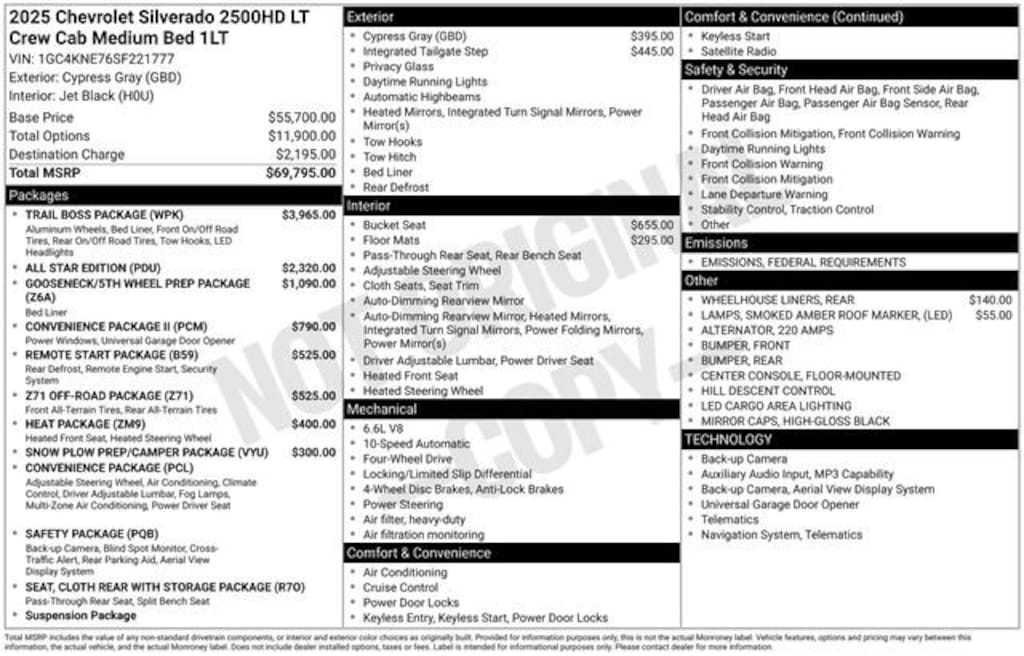 Recent Arrival! CARFAX One-Owner.*** WE DELIVER ***Cypress Gray 2025 Chevrolet Silverado 2500HD LT 4D Crew Cab 6.6L V8 10-Speed Automatic 4WDCertified. Chevrolet Certified Pre-Owned Details:* 172 Point Inspection* Warranty Deductible: $0* Roadside Assistance* Limited Warranty: 12 Month/12,000 Mile (whichever comes first) from certified purchase date* Transferable Warranty* Vehicle History* 24 months/24,000 miles (whichever comes first) Certified Pre-Owned Scheduled Maintenance Plan and 3 days/150 miles (whichever comes first) Vehicle Exchange Program. SiriusXM 3-month trial subscription.* Powertrain Limited Warranty: 72 Month/100,000 Mile (whichever comes first) from original in-service date10-Way Power Driver Seat Adjuster w/Lumbar, 120-Volt Bed Mounted Power Outlet, 120-Volt Interior Power Outlet, 17 Machined Aluminum Wheels, 170 Amp Alternator, 1st & 2nd Row All-Weather Floor Liners (LPO) (AAK), 2 Charge/Data USB Ports Inside Center Console, 2-Speed Electronic Shift Transfer Case, 220 Amp Alternator, 3.73 Rear Axle Ratio, 4-Way Manual Driver Seat Adjuster, 4-Wheel Disc Brakes, 6 Speakers, 6-Speaker Audio System, 720 Cold-Cranking Amps Heavy-Duty Battery, ABS brakes, Air Conditioning, All Star Edition, Alloy wheels, AM/FM radio: SiriusXM with 360L, Animated LED Projector Headlamps, Apple CarPlay/Android Auto, Auto High-beam Headlights, Auto-Dimming Inside Rear-View Mirror, Bed View Camera w/2 Trailer Camera Provisions, Black Chevytec Spray-On Bedliner, Black Grille Bar w/Chevy Black Bow Tie, Black Mirror Caps, Bluetooth® For Phone, Body-Color Front Bumper, Body-Color Rear Bumper, Brake assist, Bumpers: chrome, Chevrolet Connected Access Capable, Cloth Rear Seat w/Storage Package, Cloth Seat Trim, Color-Keyed Carpeting Floor Covering, Compass, Convenience Package, Convenience Package II, Deep-Tinted Glass, Delay-off headlights, Driver door bin, Driver vanity mirror, Dual front impact airbags, Dual front side impact airbags, Dual-Zone Automatic Climate Control, Durabed Pickup Bed, Electric Rear-Window Defogger, Electronic Cruise Control w/Set & Resume Speed, Electronic Stability Control, Emergency communication system: OnStar, EZ Lift Power Lock & Release Tailgate, Floor-Mounted Center Console, Front 40/20/40 Split-Bench Seats w/Lockable Storage, Front anti-roll bar, Front Bucket Seats, Front Center Armrest w/Storage, Front Frame-Mounted Red Recovery Hooks, Front LED Fog Lamps, Front reading lights, Front Rubberized Vinyl Floor Mats, Front wheel independent suspension, Fully automatic headlights, Gooseneck/5th Wheel Prep Package, Halogen Reflector Headlamps, HD Rear Vision Camera, HD Surround Vision, Heat Package, Heated & Auto-Dimming Vertical Trailering Mirrors, Heated door mirrors, Heated Driver & Front Outboard Passenger Seating, Heated Steering Wheel, Heated Vertical Trailering Mirrors, High Gloss Black Front Bumper, High Gloss Black Mirror Caps, High Gloss Black Rear Bumper, Hill Descent Control, Hitch Guidance w/Hitch View, Illuminated entry, In-Vehicle Trailering App System, Keyless Open & Start, LED Cargo Area Lighting, LED Smoked Amber Roof Marker Lamps, Low tire pressure warning, Manual Tilt & Telescoping Steering Column, Multi-Flex Tailgate, Occupant sensing airbag, Off-Road Suspension, OnStar Services Capable, Outside temperature display, Overhead airbag, Overhead console, Panic alarm, Passenger door bin, Passenger vanity mirror, Power Door Locks, Power door mirrors, Power Front Windows w/Driver Express Up/Down, Power Front Windows w/Passenger Express Down, Power Rear Windows w/Express Down, Power Sliding Rear Window w/Defogger, Power steering, Power windows, Preferred Equipment Group 1LT, Premium audio system: Chevrolet Infotainment 3 Premium, Push Button Start, Radio: Chevrolet Infotainment 3 Premium System, Rear 60/40 Folding Bench Seat (Folds Up), Rear Cross Traffic Alert, Rear reading lights, Rear Rubberized Vinyl Floor