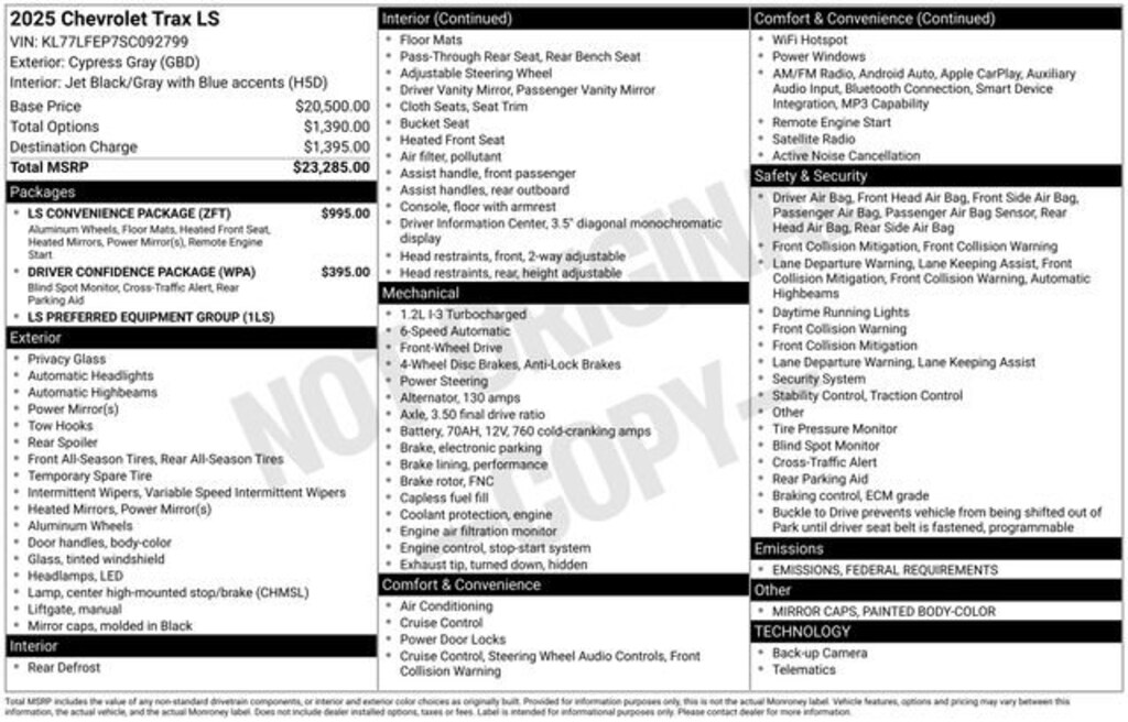 2-Way Adjustable Front Head Restraints, 3.50 Final Drive Axle Ratio, 4 Speakers, 4-Speaker Audio System Feature, 4-Way Manual Front Passenger Seat Adjuster, 4-Wheel Disc Brakes, 6-Way Manual Driver Seat Adjuster, ABS brakes, Air Conditioning, AM/FM radio: SiriusXM, Auto High-beam Headlights, Body-Color Painted Mirror Caps, Brake assist, Bumpers: body-color, Carpeted Rear Floor Mats, Cloth Seat Trim, Compass, Delay-off headlights, Driver Confidence Package, Driver door bin, Driver vanity mirror, Dual front impact airbags, Dual front side impact airbags, Electronic Stability Control, Emergency communication system: OnStar One Essentials, Exterior Parking Camera Rear, Front anti-roll bar, Front Bucket Seats, Front Center Armrest, Front reading lights, Front wheel independent suspension, Fully automatic headlights, Heated Power-Adjustable Outside Mirrors, Illuminated entry, Low tire pressure warning, LS Convenience Package, Occupant sensing airbag, Outside temperature display, Overhead airbag, Overhead console, Panic alarm, Passenger door bin, Passenger vanity mirror, Power door mirrors, Power steering, Power windows, Preferred Equipment Group 1LS, Premium audio system: Chevrolet Infotainment 3, Radio data system, Rear Cross-Traffic Alert, Rear Park Assist, Rear window defroster, Rear window wiper, Remote keyless entry, Remote Start, Security system, SiriusXM Trial Subscription, Speed control, Split folding rear seat, Spoiler, Steering wheel mounted audio controls, Tachometer, Telescoping steering wheel, Tilt steering wheel, Traction control, Trip computer, Variably intermittent wipers, Wheels: 17 Silver Painted Aluminum.