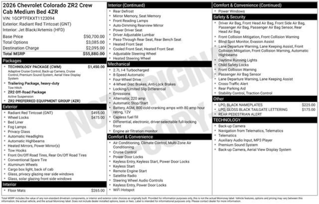 Radiant Red Tintcoat 2026 Chevrolet Colorado ZR2 4D Crew Cab 2.7L I4 Turbocharged DOHC 16V LEV3-ULEV50 310hp 8-Speed Automatic 4WD