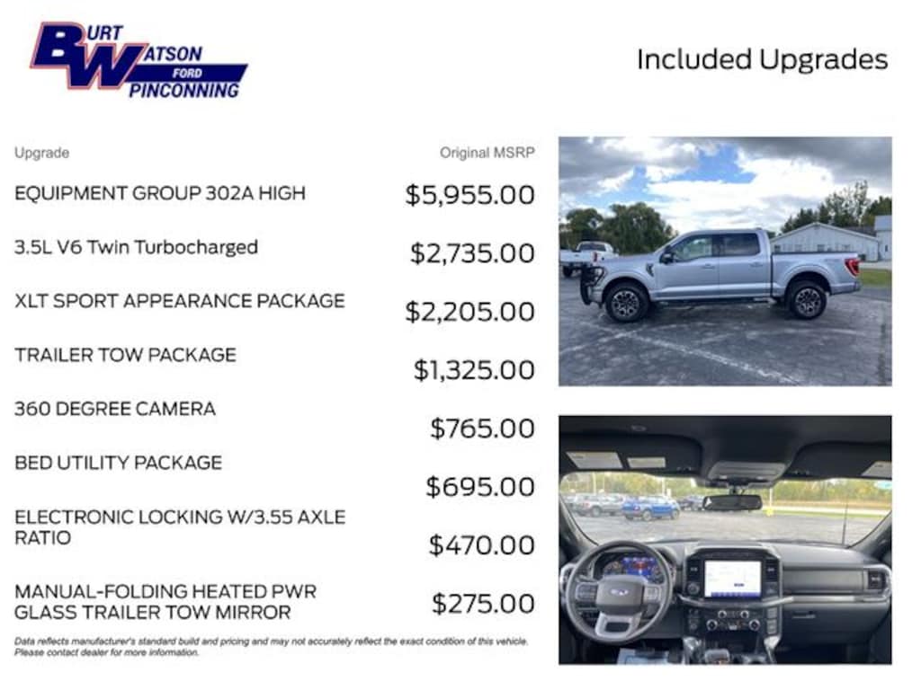 ** Originally Sold and Serviced with Burt Watson Family **, Local Trade, 172 point inspection certified, 1st oil change free with purchase, 2 Key Fobs, Ceramic coating available on all purchases at discounted pricing, service report available, Heated Seats, Digital Key, In-Vehicle Wi-Fi, Stolen vehicle location/ recovery system, 10-Way Power Driver & Passenger Seats, 2-Bar Style Grille w/Chrome 2 Minor Bars, 360 Degree Camera, 4-Wheel Disc Brakes, 4x4 FX4 Off-Road Bodyside Decal, 6 Speakers, 8" Productivity Screen in Instrument Cluster, ABS brakes, Accent-Color Step Bars, Air Conditioning, Alloy wheels, AM/FM radio, Auto High-beam Headlights, Auto Start-Stop Removal (DISC), Auto-Dimming Rear-View Mirror, Bed Utility Package, Black 2-Bar Style Grille w/Black Surround/Accents, Black 6" Angular Step Bars, Black Exterior Badging, Body-Color Door & Tailgate Handles, Body-Color Front & Rear Bumpers, Box Side Decals, BoxLink, Brake assist, Bright Polished Step Bars, Bumpers: chrome, Chrome Door & Tailgate Handles w/Body-Color Bezel, Chrome Single-Tip Exhaust, Class IV Trailer Hitch Receiver, Cloth 40/20/40 Front Seat, Compass, Connected Built-In Navigation, Dark Interior Appliques, Delay-off headlights, Driver door bin, Driver vanity mirror, Dual front impact airbags, Dual front side impact airbags, Dual Zone Electronic Automatic Temperature Control, Electronic Locking w/3.55 Axle Ratio, Electronic Stability Control, Emergency communication system: SYNC 4 911 Assist, Equipment Group 302A High, Evasive Steering Assist, Exterior Parking Camera Rear, Ford Co-Pilot360 Assist 2.0, Front anti-roll bar, Front Center Armrest w/Storage, Front fog lights, Front reading lights, Front wheel independent suspension, Fully automatic headlights, FX4 Off-Road Package, Heated door mirrors, Heated Front Seats, Hill Descent Control, Illuminated entry, Integrated Trailer Brake Controller, Intelligent Access w/Push Button Start, Intelligent Adaptive Cruise Control w/Stop & Go, Intersection Assist, LED Box Lighting, LED Reflector Headlamps, LED Sideview Mirror Spotlights, Low tire pressure warning, Matte Black Tailgate F-150 Decal, Monotube Rear Shocks, Occupant sensing airbag, Off-Road Tuned Front Shock Absorbers, Onboard 400W Outlet, Outside temperature display, Overhead airbag, Overhead console, Panic alarm, Passenger door bin, Passenger vanity mirror, Power door mirrors, Power Glass Heated Sideview Mirrors, Power steering, Power windows, Pro Trailer Backup Assist & Pro Trailer Hitch Assist, Radio data system, Radio: AM/FM SiriusXM w/360L, Radio: AM/FM Stereo w/6 Speakers, Rear reading lights, Rear step bumper, Rear Under-Seat Storage, Rear window defroster, Remote keyless entry, Remote Start System, Remote Start System w/Remote Tailgate Release, Rock Crawl Mode, SecuriCode Drivers Side Keyless-Entry Keypad, Security system, Speed control, Speed Sign Recognition, Speed-sensing steering, Split folding rear seat, Steering wheel mounted audio controls, SYNC 4, SYNC 4 w/Enhanced Voice Recognition, Tachometer, Tailgate Step w/Tailgate Work Surface, Telescoping steering wheel, Tilt steering wheel, Traction control, Trailer Tow Package, Trip computer, Unique Hood & Grille w/Black Accent, Unique Sport Cloth 40/Console/40 Front-Seats, Variably intermittent wipers, Voltmeter, Wheels: 17" Silver Painted Aluminum, Wheels: 18" 6-Spoke Machined Aluminum, Wheels: 18" Chrome-Like PVD, Wheels: 20" Gloss Black Painted Aluminum, Wrapped Steering Wheel, XLT Black Appearance Package, XLT Chrome Appearance Package, XLT Sport Appearance Package, Zone Lighting, 10-Way Power Driver & Passenger Seats, 2-Bar Style Grille w/Chrome 2 Minor Bars, 360 Degree Camera, 4-Wheel Disc Brakes, 4x4 FX4 Off-Road Bodyside Decal, 6 Spea