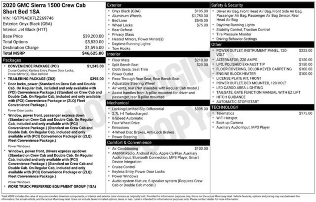 Recent Arrival! Clean CARFAX.*** WE DELIVER ***Onyx Black 2020 GMC Sierra 1500 2.7L Turbo 8-Speed Automatic 4WD 4D Crew Cab172 point inspection certified, 1st oil change free with purchase, All weather floor matts, 120-Volt Bed Mounted Power Outlet, 120-Volt Instrument Panel Power Outlet, 170 Amp Alternator, 220 Amp Alternator, 3.42 Rear Axle Ratio, 4-Way Manual Driver Seat Adjuster, 4-Way Manual Passenger Seat Adjuster, 4-Wheel Disc Brakes, 6 Speakers, 6-Speaker Audio System Feature, ABS brakes, Air Conditioning, All-Weather Floor Liner (LPO), AM/FM radio, Apple CarPlay/Android Auto, Automatic Stop/Start, Black (Semi-Gloss) Front Bumper, Black (Semi-Gloss) Rear Bumper, Black Manual Outside Mirrors, Brake assist, Bumpers: chrome, Chrome Surround Grille w/Black Mesh, Color-Keyed Carpeting Floor Covering, Convenience Package, Cruise Control, Deep-Tinted Glass, Delay-off headlights, Driver door bin, Dual front impact airbags, Dual front side impact airbags, Electric Rear-Window Defogger, Electronic Stability Control, Engine Block Heater, Exterior Parking Camera Rear, EZ Lift Power Lock & Release Tailgate, Front 40/20/40 Split-Bench Seat, Front 40/20/40 Split-Bench Seat (A52), Front anti-roll bar, Front Center Armrest, Front Frame-Mounted Black Recovery Hooks, Front License Plate Kit, Front reading lights, Front Rubberized-Vinyl Floor Mats, Front wheel independent suspension, Fully automatic headlights, Heated Power-Adjustable Outside Mirrors, Heavy Duty Suspension, Heavy-Duty Rear Locking Differential, Hitch Guidance, LED Cargo Area Lighting, Low tire pressure warning, Occupant sensing airbag, Outside temperature display, Overhead airbag, Overhead console, Passenger door bin, Passenger vanity mirror, Polished Exhaust Tip, Power Rear Windows w/Express Down, Power steering, Power windows, Preferred Equipment Group 1SA, Premium audio system: GMC Infotainment System, Radio data system, Radio: GMC Infotainment Audio System, Rear reading lights, Rear Rubberized-Vinyl Floor Mats, Rear step bumper, Remote Keyless Entry, Single-Zone Manual/Semi-Automatic Air Conditioning, Solar Absorbing Tinted Glass, Speed-sensing steering, Split folding rear seat, Spray-On Pickup Bed Liner w/GMC Logo, Tachometer, Tilt steering wheel, Traction control, Trailering Package, Trip computer, Variably intermittent wipers, Vinyl Seat Trim, Voltmeter, Wheel Locks (Set of 4) (LPO), Wheels: 17 x 8 Silver Painted Steel, Wheels: 20 x 9 Black Gloss Painted Aluminum, 120-Volt Bed Mounted Power Outlet, 120-Volt Instrument Panel Power Outlet, 170 Amp Alternator, 220 Amp Alternator, 3.42 Rear Axle Ratio, 4-Way Manual Driver Seat Adjuster, 4-Way Manual Passenger Seat Adjuster, 4-Wheel Disc Brakes, 6 Speakers, 6-Speaker Audio System Feature, ABS brakes, Air Conditioning, All-Weather Floor Liner (LPO), AM/FM radio, Apple CarPlay/Android Auto, Automatic Stop/Start, Black (Semi-Gloss) Front Bumper, Black (Semi-Gloss) Rear Bumper, Black Manual Outside Mirrors, Brake assist, Bumpers: chrome, Chrome Surround Grille w/Black Mesh, Color-Keyed Carpeting Floor Covering, Convenience Package, Cruise Control, Deep-Tinted Glass, Delay-off headlights, Driver door bin, Dual front impact airbags, Dual front side impact airbags, Electric Rear-Window Defogger, Electronic Stability Control, Engine Block Heater, Exterior Parking Camera Rear, EZ Lift Power Lock & Release Tailgate, Front 40/20/40 Split-Bench Seat, Front 40/20/40 Split-Bench Seat (A52), Front anti-roll bar, Front Center Armrest, Front Frame-Mounted Black Recovery Hooks, Front License Plate Kit, Front reading lights, Front Rubberized-Vinyl Floor Mats, Front wheel independent suspension, Fully automatic headlights, Heated Power-Adjustable Outside Mirrors, Heavy Duty Suspension, Heavy-Duty Rear Locking Differential, Hitch Guidance, LED Cargo Area Lighting, Low tire pressure warning, Occupant sensing airbag, Outside temperature display, Overhead airbag, Overhead console, Passenger door bin, Passenger vanit