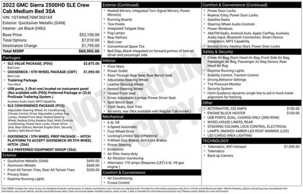Local Trade, Non Smoker, 172 point inspection certified, 1st oil change free with purchase, 2 Key Fobs, 10-Way Power Driver Seat Adjuster w/Lumbar, 12-Volt Rear Auxiliary Power Outlet, 17 Machined Aluminum Wheels, 18 Machined Aluminum Wheels, 2-Speed Electronic Shift Transfer Case, 220 Amps Alternator, 2nd Row Dual USB Charge-Only Ports, 3 Years of OnStar & Connected Services Plan, 3.73 Rear Axle Ratio, 4-Way Manual Driver Seat Adjuster, 4-Way Manual Passenger Seat Adjuster, 4-Wheel Disc Brakes, 6 Speakers, 6-Speaker Audio System Feature, A/C w/Dual-Zone Automatic Climate Control, ABS brakes, Air Conditioning, Alloy wheels, AM/FM radio: SiriusXM, Apple CarPlay/Android Auto, Brake assist, Bumpers: chrome, Chrome Surround Grille w/High Gloss Black Mesh, Cloth Seat Trim, Compass, Compass Located In Instrument Cluster, Deep-Tinted Glass, Delay-off headlights, Driver door bin, Driver vanity mirror, Dual front impact airbags, Dual front side impact airbags, Electric Rear-Window Defogger, Electrical Lock Control Steering Column, Electronic Stability Control, Emergency communication system: OnStar and GMC Connected Services capable, Engine Block Heater, Front 40/20/40 Split-Bench Seats, Front 40/20/40 Split-Bench Seats w/Lockable Storage, Front anti-roll bar, Front Center Armrest w/Storage, Front reading lights, Front wheel independent suspension, Fully automatic headlights, GMC Connected Access Capable, Gooseneck/5th Wheel Package, Gooseneck/5th Wheel Prep Package, Heated door mirrors, Heated Driver & Front Outboard Passenger Seats, Heated Steering Wheel, Heavy-Duty 80 Amp Battery, Illuminated entry, Integrated Trailer Brake Controller, Keyless Open & Start, LED Cargo Area Lighting, LED Fog Lamps, LED Smoked Amber Roof Marker Lamps, Low tire pressure warning, Manual Tilt Wheel Steering Column, Manual Tilt-Wheel/Telescoping Steering Column, Occupant sensing airbag, OnStar & GMC Connected Services Capable, Outside temperature display, Overhead airbag, Overhead console, Panic alarm, Passenger door bin, Passenger vanity mirror, Pickup Box, Power Door Locks, Power door mirrors, Power Front Windows w/Passenger Express Down, Power Rear Windows w/Express Down, Power steering, Power windows, Power Windows w/Driver Express Up/Down, Preferred Equipment Group 3SA, Premium audio system: GMC Infotainment System, Radio: AM/FM w/GMC Infotainment System, Rear reading lights, Rear step bumper, Rear Vision Camera Delete, Rear Wheelhouse Liners, Remote Keyless Entry, Remote keyless entry, Remote Vehicle Starter System, SiriusXM Radio, SLE Convenience Package, SLE Value Package, Speed control, Split folding rear seat, Spray-On Pickup Box Bed Liner w/GMC Logo, Steering Wheel Audio Controls, Steering wheel mounted audio controls, Suspension Package, Tachometer, Tilt steering wheel, Traction control, Trip computer, Turn signal indicator mirrors, Unauthorized Entry Theft-Deterrent System, Variably intermittent wipers, Voltmeter, Wi-Fi Hotspot Capable, 10-Way Power Driver Seat Adjuster w/Lumbar, 12-Volt Rear Auxiliary Power Outlet, 17 Machined Aluminum Wheels, 18 Machined Aluminum Wheels, 2-Speed Electronic Shift Transfer Case, 220 Amps Alternator, 2nd Row Dual USB Charge-Only Ports, 3 Years of OnStar & Connected Services Plan, 3.73 Rear Axle Ratio, 4-Way Manual Driver Seat Adjuster, 4-Way Manual Passenger Seat Adjuster, 4-Wheel Disc Brakes, 6 Speakers, 6-Speaker Audio System Feature, A/C w/Dual-Zone Automatic Climate Control, ABS brakes, Air Conditioning, Alloy wheels, AM/FM radio: SiriusXM, Apple CarPlay/Android Auto, Brake assist, Bumpers: chrome, Chrome Surround Grille w/High Gloss Black Mesh, Cloth Seat Trim, Compass, Compass Located In Instrument Cluster, Deep-Tinted Glass, Delay-off headlights, Driver door bin, Driver vanity mir