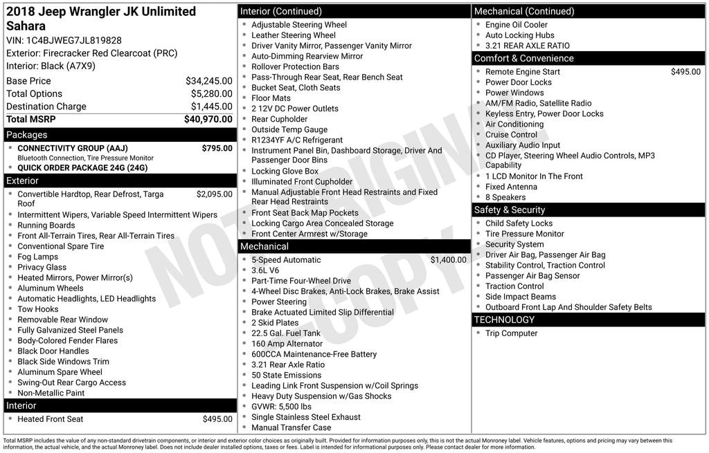125 point inspection, Wrangler JK Unlimited Sahara, 4D Sport Utility, 3.6L V6 24V VVT, 5-Speed Automatic, 4WD, 18" x 7.5" Polished Satin Carbon Wheels, 4-Wheel Disc Brakes, 8 Speakers, ABS brakes, Air Conditioning, AM/FM radio: SiriusXM, Audio Jack Input for Mobile Devices, Auto-dimming Rear-View mirror, Body Color Appliques Front Bumper, Body Color Appliques Rear Bumper, Body Color/Accent Color Grille, Brake assist, CD player, Cloth Seats w/Adjustable Head Restraints, Connectivity Group, Driver Height Adjuster Seat, Driver vanity mirror, Dual front impact airbags, Electronic Stability Control, Front Bucket Seats, Front Center Armrest w/Storage, Front fog lights, Front reading lights, Front Seat Back Map Pockets, Fully automatic headlights, Heated door mirrors, Heated Front Seats, Heavy Duty Suspension w/Gas Shocks, Illuminated entry, Integrated roll-over protection, Leather steering wheel, Low tire pressure warning, Occupant sensing airbag, Outside temperature display, Panic alarm, Passenger door bin, Passenger vanity mirror, Power door mirrors, Power steering, Power windows, Quick Order Package 24G, R1234YF A/C Refrigerant, Radio data system, Radio: 130, Rear anti-roll bar, Remote keyless entry, Remote Start System, Security system, Speed control, Split folding rear seat, Steering wheel mounted audio controls, Tachometer, Tilt steering wheel, Tire Pressure Monitoring Display, Traction control, Uconnect Voice Command w/Bluetooth, Variably intermittent wipers, Vehicle Information Center, 3.21 Rear Axle Ratio, Alloy wheels, Compass, Driver door bin, Front anti-roll bar, Trip computer, Wrangler JK Unlimited Sahara, 4D Sport Utility, 3.6L V6 24V VVT, 5-Speed Automatic, 4WD, 18" x 7.5" Polished Satin Carbon Wheels, 4-Wheel Disc Brakes, 8 Speakers, ABS brakes, Air Conditioning, AM/FM radio: SiriusXM, Audio Jack Input for Mobile Devices, Auto-dimming Rear-View mirror, Body Color Appliques Front Bumper, Body Color Appliques Rear Bumper, Body Color/Accent Color Grille, Brake assist, CD player, Cloth Seats w/Adjustable Head Restraints, Connectivity Group, Driver Height Adjuster Seat, Driver vanity mirror, Dual front impact airbags, Electronic Stability Control, Front Bucket Seats, Front Center Armrest w/Storage, Front fog lights, Front reading lights, Front Seat Back Map Pockets, Fully automatic headlights, Heated door mirrors, Heated Front Seats, Heavy Duty Suspension w/Gas Shocks, Illuminated entry, Integrated roll-over protection, Leather steering wheel, Low tire pressure warning, Occupant sensing airbag, Outside temperature display, Panic alarm, Passenger door bin, Passenger vanity mirror, Power door mirrors, Power steering, Power windows, Quick Order Package 24G, R1234YF A/C Refrigerant, Radio data system, Radio: 130, Rear anti-roll bar, Remote keyless entry, Remote Start System, Security system, Speed control, Split folding rear seat, Steering wheel mounted audio controls, Tachometer, Tilt steering wheel, Tire Pressure Monitoring Display, Traction control, Uconnect Voice Command w/Bluetooth, Variably intermittent wipers, Vehicle Information Center.