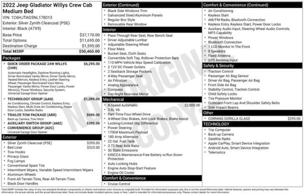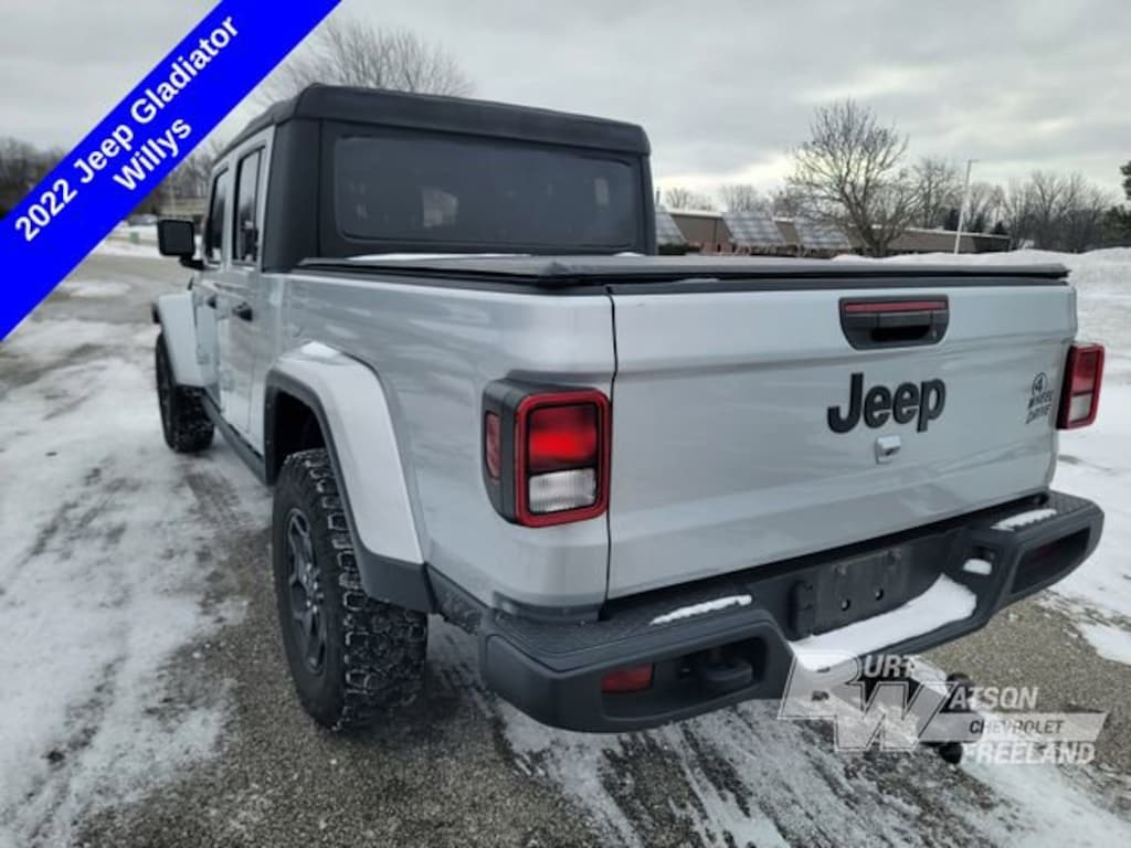 Recent Arrival! CARFAX One-Owner. Clean CARFAX. Priced below KBB Fair Purchase Price!*** WE DELIVER ***Silver Zynith Clearcoat 2022 Jeep Gladiator Willys 4D Crew Cab 3.6L V6 24V VVT 8-Speed Automatic 4WD110 MPH Vehicle Max Speed Calibration, 2-Door Passive Entry, Front Door Locks, 3.73 Rear Axle Ratio, 4-Wheel Disc Brakes, 4-Wheel Drive Decal, 8 Speakers, ABS brakes, Air Conditioning, Air Conditioning w/Auto Temperature Control, AM/FM radio, Apple CarPlay, Apple CarPlay/Android Auto, Auxiliary Switch Group, Brake assist, Cloth Low-Back Bucket Seats, Compass, Convenience Group, Corning Gorilla Glass, Delay-off headlights, Driver door bin, Driver vanity mirror, Dual front impact airbags, Dual front side impact airbags, Electronic Stability Control, Emergency communication system: SiriusXM Guardian, Front anti-roll bar, Front Bucket Seats, Front Center Armrest w/Storage, Front fog lights, Front reading lights, Google Android Auto, GPS Antenna Input, Integrated Center Stack Radio, Integrated roll-over protection, Integrated Voice Command w/Bluetooth, Low tire pressure warning, Mold In Color Bumper w/Gloss Black, MOPAR Spray In Bedliner, Normal Duty Suspension, Occupant sensing airbag, Outside temperature display, ParkView Rear Back-Up Camera, Passenger door bin, Passenger vanity mirror, Power steering, Quick Order Package 24W Willys, Radio data system, Radio: Uconnect 4 w/7 Display, Rear anti-roll bar, Rear reading lights, SiriusXM Radio Service, SiriusXM Satellite Radio, Speed control, Split folding rear seat, Steering wheel mounted audio controls, Tachometer, Technology Group, Telescoping steering wheel, Tilt steering wheel, Traction control, Trailer Tow Package, Trip computer, USB Host Flip, Variably intermittent wipers, Wheels: 17 x 7.5 Black Steel Styled.