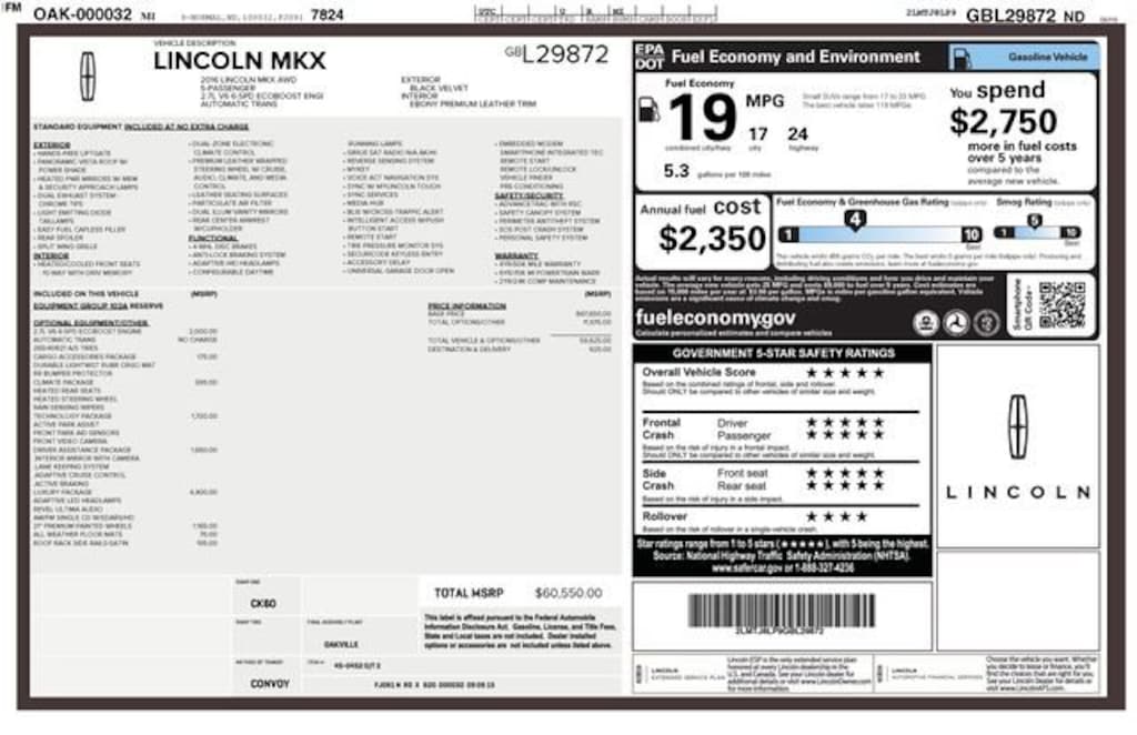 Recent Arrival! Odometer is 43045 miles below market average! Priced below KBB Fair Purchase Price!*** WE DELIVER ***Black Velvet 2016 Lincoln MKX Reserve 4D Sport Utility 2.7L V6 EcoBoost 6-Speed Automatic AWD10 Speakers, 3.65 Axle Ratio, 4-Wheel Disc Brakes, ABS brakes, Adaptive suspension, Air Conditioning, Alloy wheels, AM/FM radio: SiriusXM, AM/FM Stereo w/Single CD, Auto-dimming door mirrors, Auto-dimming Rear-View mirror, Automatic temperature control, Blind spot sensor: BLIS warning, Brake assist, Bumpers: body-color, CD player, Compass, Delay-off headlights, Driver door bin, Driver vanity mirror, Dual front impact airbags, Dual front side impact airbags, Electronic Stability Control, Emergency communication system: SYNC 3 911 Assist, Exterior Parking Camera Rear, Four wheel independent suspension, Front anti-roll bar, Front Bucket Seats, Front Center Armrest, Front dual zone A/C, Front fog lights, Front reading lights, Fully automatic headlights, Garage door transmitter: HomeLink, Heated door mirrors, Heated front seats, High-Intensity Discharge Headlights, Illuminated entry, Knee airbag, Low tire pressure warning, Memory seat, Navigation System, Occupant sensing airbag, Outside temperature display, Overhead airbag, Overhead console, Panic alarm, Passenger door bin, Passenger vanity mirror, Power door mirrors, Power driver seat, Power Liftgate, Power moonroof, Power passenger seat, Power steering, Power windows, Prem Lthr-Trimmed Heated/Cooled Bucket Seats (BE), Radio data system, Rear anti-roll bar, Rear Parking Sensors, Rear reading lights, Rear seat center armrest, Rear window defroster, Rear window wiper, Remote keyless entry, Security system, Speed control, Speed-Sensitive Wipers, Split folding rear seat, Spoiler, Steering wheel memory, Steering wheel mounted A/C controls, Steering wheel mounted audio controls, SYNC 3, Tachometer, Telescoping steering wheel, Tilt steering wheel, Traction control, Trip computer, Turn signal indicator mirrors, Variably intermittent wipers, Ventilated front seats, Wheels: 20 Premium Painted Aluminum w/20 Spokes.