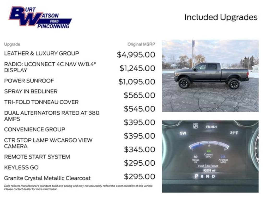 172 point inspection certified, 1st oil change free with purchase, Ceramic coating available on all purchases at discounted pricing, service report available, Heated Seats, #1 Seat Foam Cushion, 115V Auxiliary Power Outlet, 40/20/40 Split Bench Seat, 9 Alpine Speakers w/Subwoofer, Auto High Beam Headlamp Control, Auto-Dimming Exterior Mirrors, Auto-Dimming Rear-View Mirror, Black Painted Exterior Mirrors, Black Power Fold-Away Mirrors, Charge Only Remote USB Port, Convenience Group, Deluxe Door Trim Panel, Exterior Mirrors Courtesy Lamps, Exterior Mirrors w/Memory, Exterior Mirrors w/Supplemental Signals, Flat Black 6.4L Hemi Badge, Flat Black Ram 2500 Badge, Folding Flat Load Floor Storage, Front Armrest w/Cupholders, Front Center Seat Cushion Storage, Front Door Accent Lighting, Glove Box Lamp, Heated Front Seats, Heated Steering Wheel, High Back Seats, Leather & Luxury Group, Leather Trim 40/20/40 Bench Seat, LED Interior Lighting, Overhead Console w/Garage Door Opener, ParkSense Front/Rear Park Assist System, Power 10-Way Memory Driver & 6-Way Passenger Seats, Power Folding Mirrors, Power Lumbar Adjust, Quick Order Package 22P Power Wagon, Radio/Driver Seat/Mirror Memory, Rain Sensitive Windshield Wipers, Rear 60/40 Split Folding Seat, Rear Dome w/On/Off Switch Lamp, Rear Door Accent Lighting, Security Alarm, Sun Visors w/Illuminated Vanity Mirrors, Universal Garage Door Opener, Ventilated Front Seats, 1-Year SiriusXM Guardian Trial, 220 Amp Alternator, 4-Wheel Disc Brakes, 4.10 Axle Ratio, 5-Year SiriusXM Traffic Service, 5-Year SiriusXM Travel Link Service, 6 Speakers, 8.4" Touchscreen Display, ABS brakes, Air Conditioning, Air Conditioning ATC w/Dual Zone Control, Alloy wheels, AM/FM radio: SiriusXM, Apple CarPlay, Auto-dimming Rear-View mirror, Black Exterior Mirrors, Black MIC Exterior Mirrors, Block heater, Brake assist, Cloth Bench Seat w/Emboss Tread Pattern, Compass, CTR Stop Lamp w/Cargo View Camera, Delay-off headlights, Driver door bin, Dual Alternators Rated At 380 Amps, Dual front impact airbags, Dual front side impact airbags, Electronic Stability Control, Engine Block Heater, Exterior Mirrors w/Heating Element, For Details Visit DriveUconnect.com, Front anti-roll bar, Front Center Armrest w/Storage, Front fog lights, Front reading lights, Fully automatic headlights, Google Android Auto, GPS Antenna Input, GPS Navigation, HD Radio, Heated door mirrors, Illuminated entry, Integrated Center Stack Radio, Integrated Voice Command w/Bluetooth, KEYLESS GO®, Leather steering wheel, LED Bed Lighting, Locking Tailgate, Low tire pressure warning, Media Hub (2 USB, AUX), Occupant sensing airbag, Outside temperature display, Overhead airbag, Overhead console, Panic alarm, ParkView Rear Back-Up Camera, Passenger door bin, Passenger vanity mirror, Power Adjustable Pedals w/Memory, Power door mirrors, Power Fold Black Trailer Tow Mirror w/Memory, Power steering, Power Sunroof, Power windows, Powerwagon Badging Delete, Radio data system, Radio: Uconnect 3 w/5" Display, Radio: Uconnect 4C Nav w/8.4" Display, Radio/Driver Seat/Mirrors/Pedals Memory, Rear seat center armrest, Rear step bumper, Rear Window Defroster, Remote keyless entry, Remote Proximity Keyless Entry, Remote Start System, SiriusXM Satellite Radio, SiriusXM Traffic Plus, SiriusXM Travel Link, Speed control, Split folding rear seat, Spray In Bedliner, Steering wheel mounted audio controls, Tachometer, Tilt steering wheel, Traction control, Trailer Tow Mirrors, Tri-Fold Tonneau Cover, Trip computer, Variably intermittent wipers, Vendor Painted Cargo Box Tracking, Voltmeter, Wheels: 17" x 8.0" Aluminum w/Matte Black Pocket, #1 Seat Foam Cushion, 115V Auxiliary Power Outlet, 40/20/40 Split Bench Seat, 9 Alpine Speakers w/Subwoofer, Auto High Beam Headlamp Control, Auto-Dimming Exte
