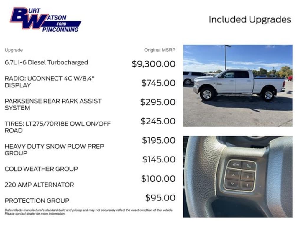 Local Trade, Non Smoker, 2 key sets, 172 point inspection certified, All weather floor matts, 1-Year SiriusXM Guardian Trial, 220 Amp Alternator, 3.42 Axle Ratio, 3.73 Axle Ratio, 4-Wheel Disc Brakes, 40/20/40 Split Bench Seat, 6 Speakers, 8.4" Touchscreen Display, ABS brakes, Air Conditioning, Air Conditioning ATC w/Dual Zone Control, AM/FM radio: SiriusXM, Apple CarPlay, Black Exterior Mirrors, Brake assist, Bumpers: chrome, Center Hub, Charge Only Remote USB Port, Cloth 40/20/40 Bench Seat, Compass, Delay-off headlights, Driver door bin, Dual front impact airbags, Dual front side impact airbags, Electronic Stability Control, Electronically Controlled Throttle, For Details Visit DriveUconnect.com, Front anti-roll bar, Front Armrest w/Cupholders, Front Center Armrest w/Storage, Front reading lights, Fully automatic headlights, Google Android Auto, GPS Antenna Input, HD Radio, Heated door mirrors, Heavy Duty Snow Plow Prep Group, Hemi Badge, Illuminated entry, Integrated Center Stack Radio, Integrated Voice Command w/Bluetooth, Locking Tailgate, Low tire pressure warning, Manual Adjust Seats, Media Hub (2 USB, AUX), Next Generation Engine Controller, Occupant sensing airbag, Outside temperature display, Overhead airbag, Overhead console, Panic alarm, ParkSense Rear Park Assist System, ParkView Rear Back-Up Camera, Passenger door bin, Passenger vanity mirror, Power door mirrors, Power steering, Power windows, Protection Group, Quick Order Package 2FG SLT, Radio data system, Radio: Uconnect 3 w/5" Display, Radio: Uconnect 4C w/8.4" Display, Rear Power Sliding Window, Rear seat center armrest, Rear step bumper, Remote keyless entry, SiriusXM Satellite Radio, Speed control, Tachometer, Tilt steering wheel, Tip Start, Traction control, Trip computer, USB Host Flip, Variably intermittent wipers, Vendor Painted Cargo Box Tracking, Voltmeter, Wheels: 18" x 8.0" Steel Chrome Clad.