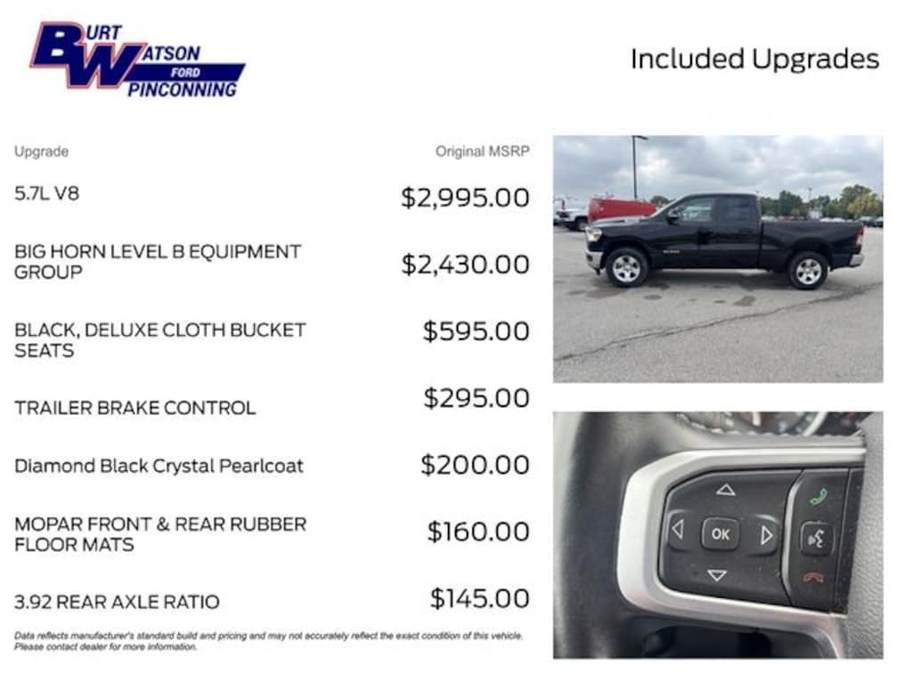 Local Trade, Non Smoker, 172 point inspection certified, Heated Seats, 115V Auxiliary Power Outlet, 115V Auxiliary Rear Power Outlet, 3 Rear Seat Head Restraints, 3.21 Rear Axle Ratio, 3.92 Rear Axle Ratio, 4 Way Front Headrests, 4-Wheel Disc Brakes, 400W Inverter, 48V Belt Starter Generator, 4G LTE Wi-Fi Hot Spot, 6 Speakers, ABS brakes, Air Conditioning, Air Conditioning ATC w/Dual Zone Control, Alloy wheels, AM/FM radio, Auto-Dimming Exterior Driver Mirror, Big Horn Level B Equipment Group (DISC), Black Exterior Mirrors, Black Premium Power Mirrors (GUL), Bluetooth Handsfree Phone & Audio, Brake assist, Bumpers: chrome, Cloth Bench Seat, Compass, Connectivity - US/Canada, Convex Wide-Angle Mirror Insert, Delay-off headlights, Driver door bin, Dual front impact airbags, Dual front side impact airbags, Electronic Stability Control, Emergency communication system: SiriusXM Guardian, For More Info, Call 800-643-2112, Front anti-roll bar, Front Center Armrest w/Storage, Front fog lights, Front License Plate Bracket, Front reading lights, Front Seat Back Map Pockets, Front wheel independent suspension, Fully automatic headlights, Global Telematics Box Module (TBM), Glove Box Lamp, Google Android Auto, GPS Antenna Input, Heated door mirrors, Heated Front Seats, Heated Steering Wheel, Illuminated entry, Integrated Voice Command w/Bluetooth, Leather steering wheel, Low tire pressure warning, Manual Adjust 4-Way Front Passenger Seat, Manufacturer's Statement of Origin, Media Hub w/2 Charge Only USBs, MOPAR Front & Rear Rubber Floor Mats, Occupant sensing airbag, Outside temperature display, Overhead airbag, Overhead console, Panic alarm, ParkSense Front/Rear Park Assist w/Stop, ParkView Rear Back-Up Camera, Passenger door bin, Passenger vanity mirror, Power 2-Way Driver Lumbar Adjust, Power door mirrors, Power steering, Power windows, Quick Order Package 25Z Big Horn, Radio data system, Radio: Uconnect 3 w/5" Display, Radio: Uconnect 5 W w/8.4" Display, Rear 60/40 Folding Seat, Rear anti-roll bar, Rear Dome w/On/Off Switch Lamp, Rear seat center armrest, Rear step bumper, Rear Window Defroster, Remote keyless entry, Remote Start System, Security Alarm, SiriusXM Radio Service, Speed control, Split folding rear seat, Steering wheel mounted audio controls, Tachometer, Telescoping steering wheel, Tilt steering wheel, Traction control, Trailer Brake Control, Trip computer, Universal Garage Door Opener, USB Host Flip, Variably intermittent wipers, Voltmeter, Wheels: 18" x 8" Cast-Aluminum Painted.
