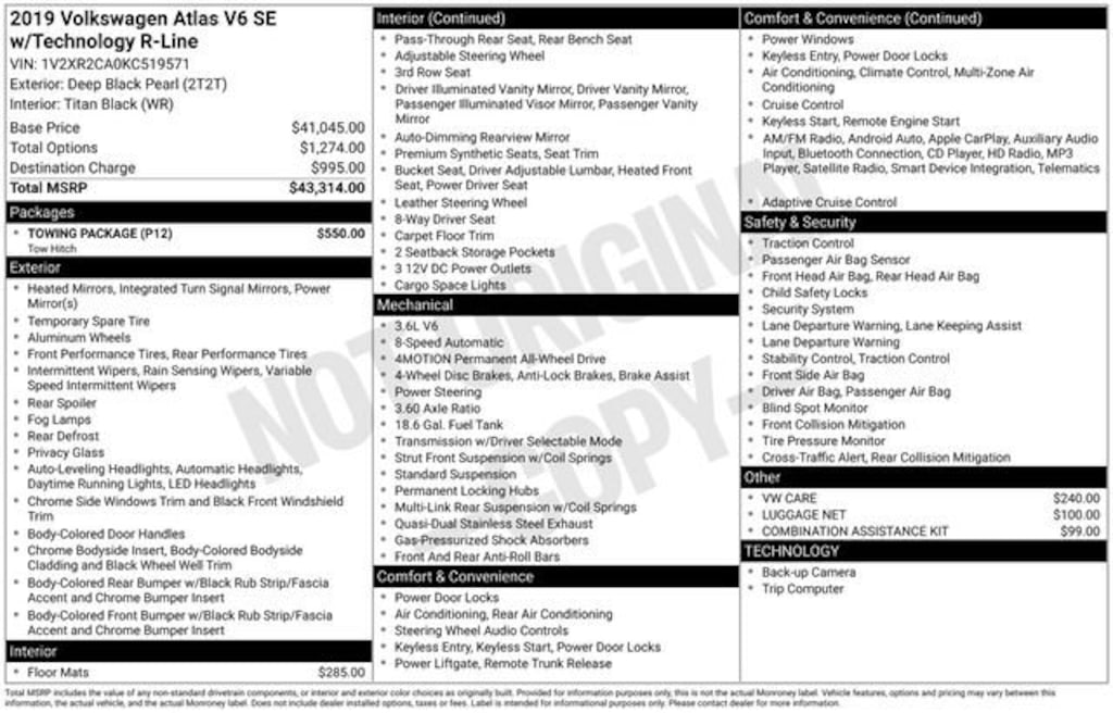 20 Twin 5-Spoke Alloy Wheels, 3.60 Axle Ratio, 3rd row seats: split-bench, 4-Wheel Disc Brakes, 8 Speakers, ABS brakes, Active Blind Spot Monitor, Air Conditioning, Alloy wheels, AM/FM radio: SiriusXM, Auto-dimming Rear-View mirror, Automatic temperature control, Brake assist, Bumpers: body-color, Compass, Delay-off headlights, Driver door bin, Driver vanity mirror, Dual front impact airbags, Dual front side impact airbags, Electronic Stability Control, Emergency communication system: VW Car-Net services (capabilities require enrollment or subscription), Exterior Parking Camera Rear, First Aid Kit, Forward collision: FCW w/Autonomous Emergency Braking mitigation, Four wheel independent suspension, Front anti-roll bar, Front Bucket Seats, Front Center Armrest, Front dual zone A/C, Front fog lights, Front reading lights, Heated Comfort Front Bucket Seats, Heated door mirrors, Heated front seats, Heavy Duty Trunk Liner w/VW CarGo Blocks, Illuminated entry, Low tire pressure warning, Luggage Net, Occupant sensing airbag, Outside temperature display, Overhead airbag, Overhead console, Panic alarm, Passenger door bin, Passenger vanity mirror, Power door mirrors, Power driver seat, Power Liftgate, Power steering, Power windows, Radio data system, Radio: Composition Media 8.0 Touchscreen, Rain sensing wipers, Rear air conditioning, Rear anti-roll bar, Rear reading lights, Rear seat center armrest, Rear window defroster, Rear window wiper, Remote CD player, Remote keyless entry, Roadside Assistance Kit, Roof rack: rails only, Rubber Mats Kit - Bench Seats, Security system, Speed control, Speed-sensing steering, Split folding rear seat, Spoiler, Standard Suspension, Steering wheel mounted audio controls, Tachometer, Telescoping steering wheel, Tilt steering wheel, Towing Package, Traction control, Trip computer, Turn signal indicator mirrors, V-Tex Leatherette Seating Surfaces, Variably intermittent wipers, VW Care.